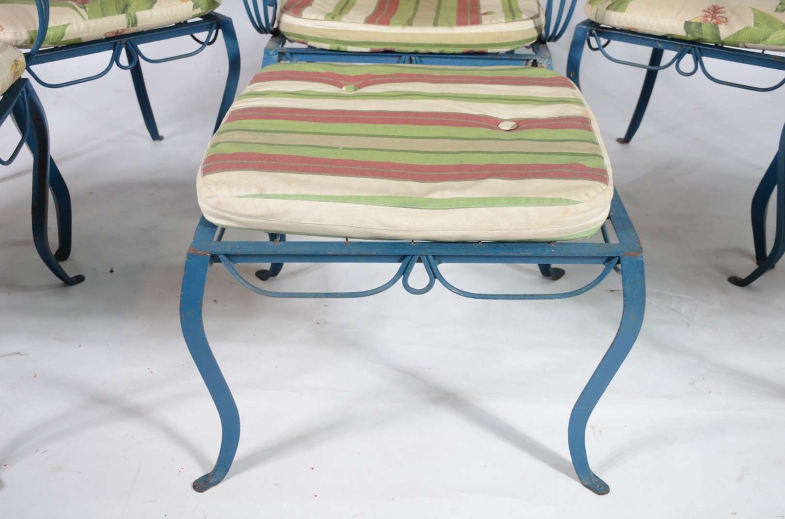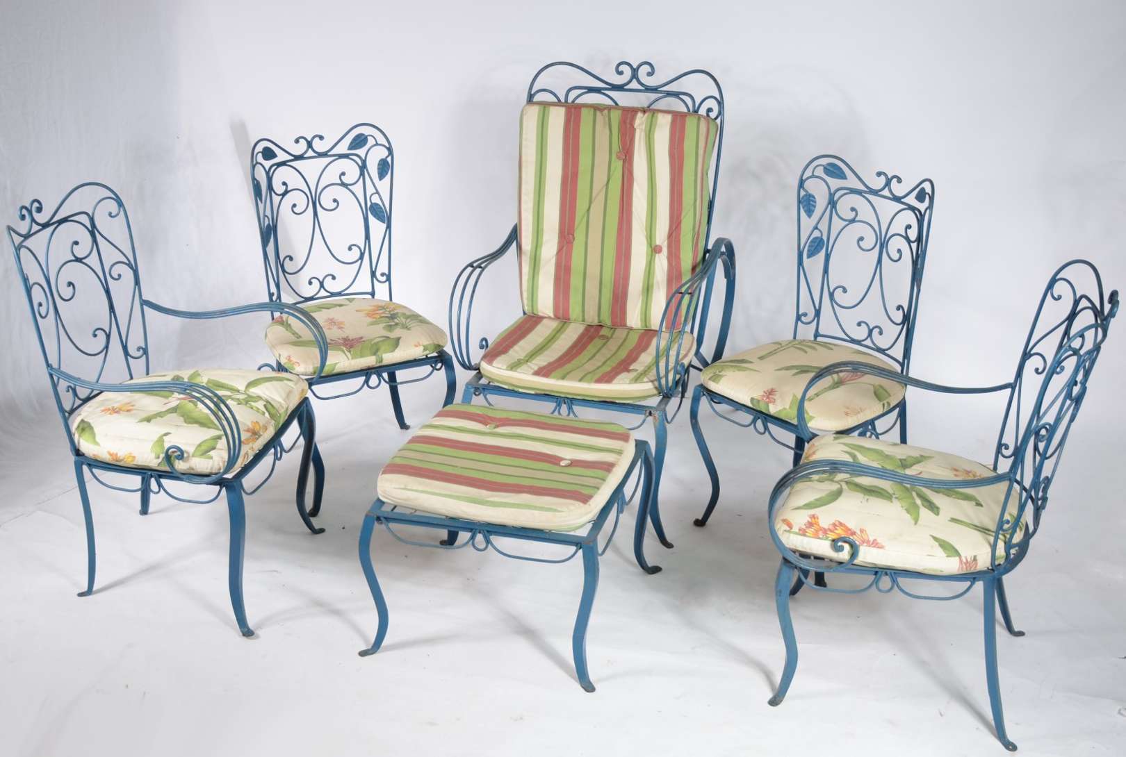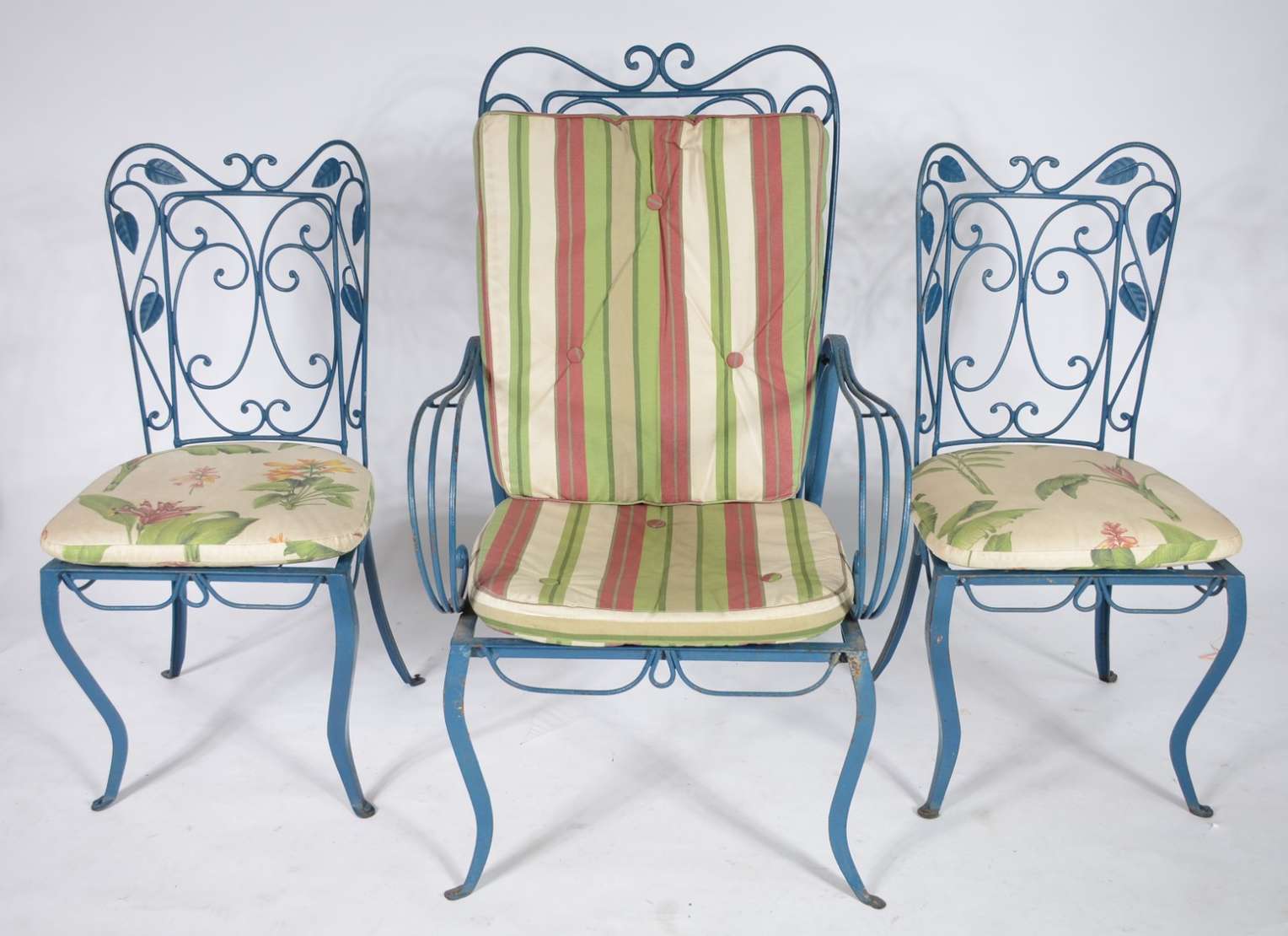 Cadeira de balanço e banqueta de madeira nobre, estofados e forrados em tecido branco com capitoné. Faltando dois "bo...