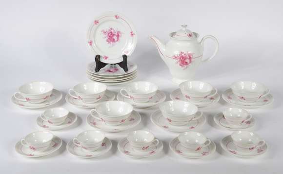Serviço de chá e café de porcelana portuguesa Vista Alegre, decorado com guirlandas florais cor de rosa, composto de:...