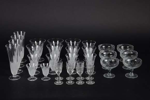 Serviço de cristal da Bohemia (com mofo), composto de: 11 flutes, 12 para água, 12 para vinho branco, 12 para vinho t...