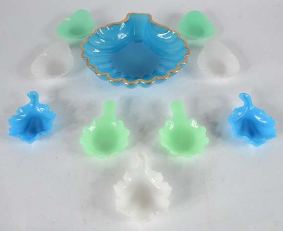 Bowl feitio concha de opalina azul com borda dourada. Acompanham dois pratinhos feitio "folha" azuis, um branco, 2 ve...