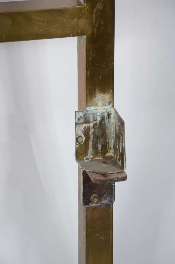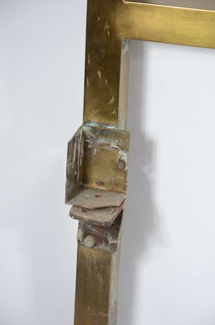 Mesa de centro com duas bases quadrangulares de madeira, detalhes entalhados, tampo de mármore.