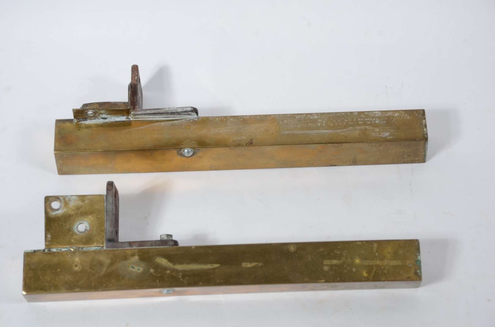 Par de cadeiras com braços de madeira nobre, assentos estofados e encostos de palhinha, pernas cilíndricas frisadas.