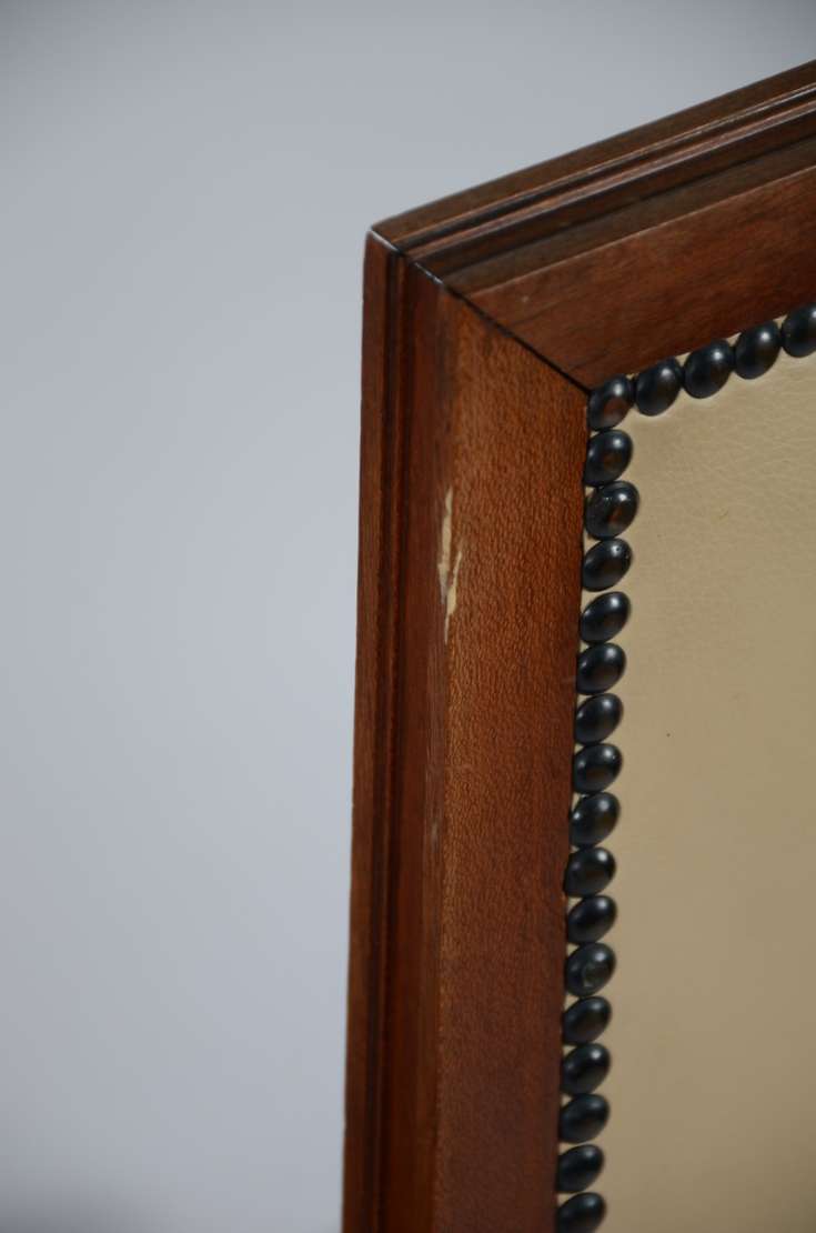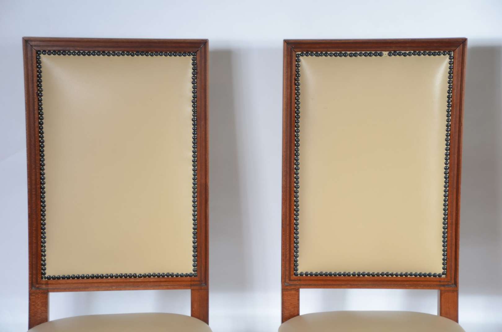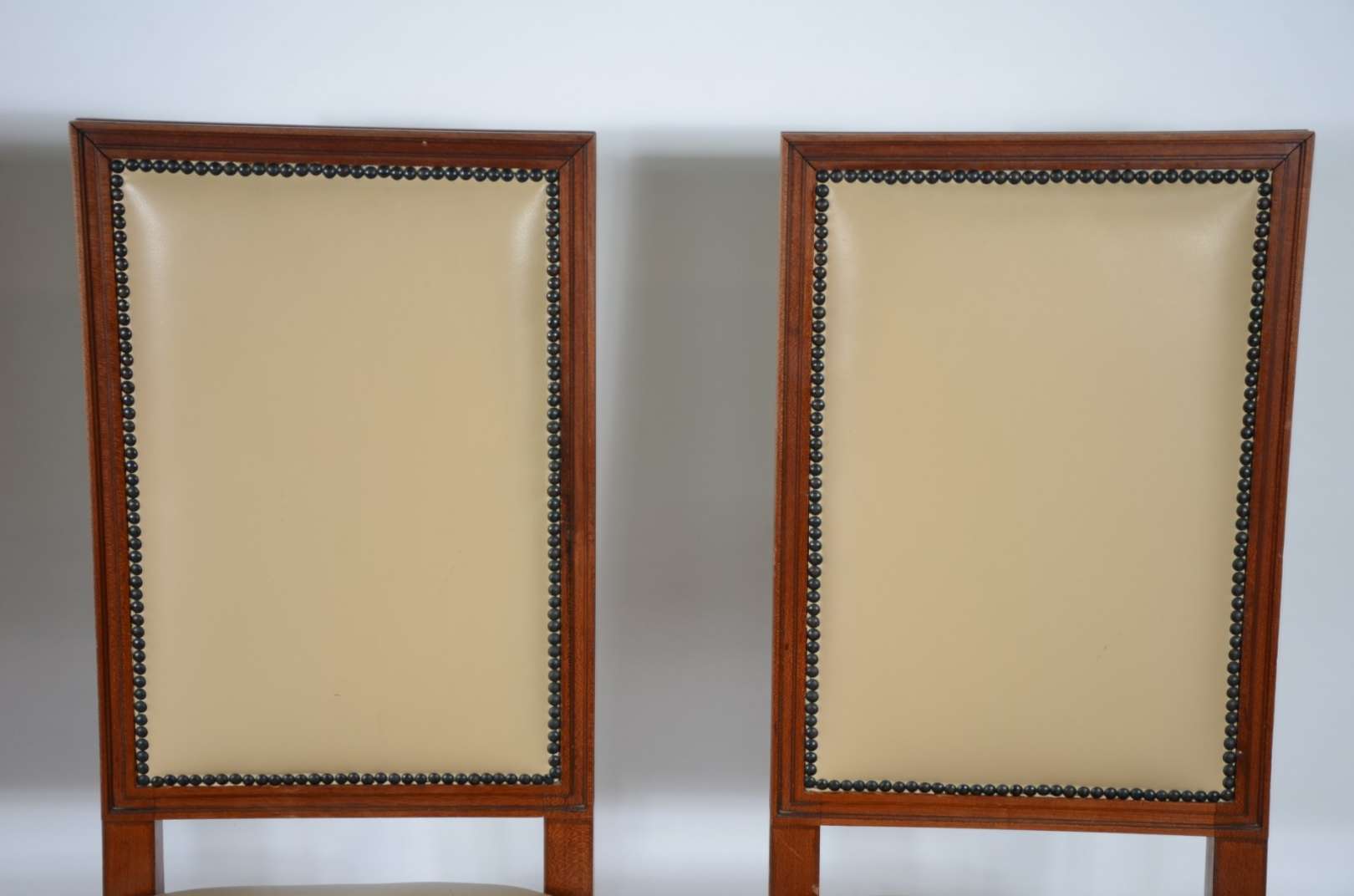 Conjunto com 4 cadeiras de madeira nobre para sala de jantar, estofadas e forradas com tecido bege estampado e tachea...