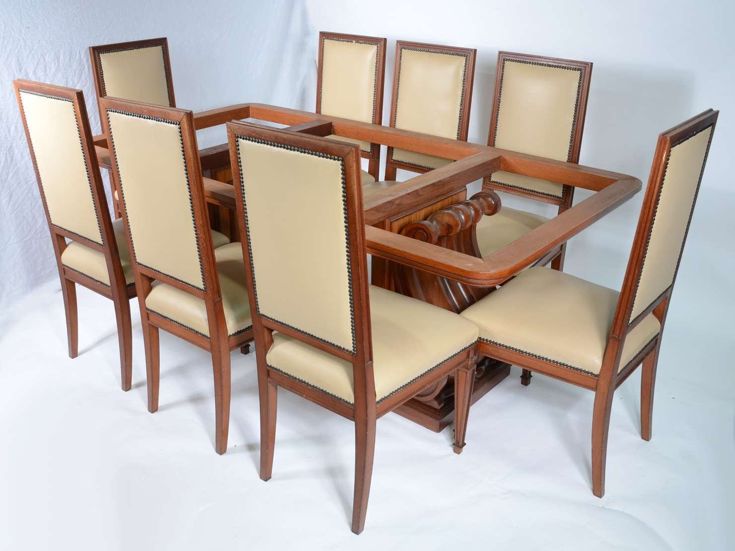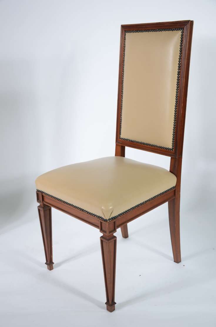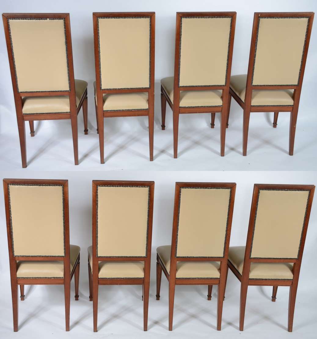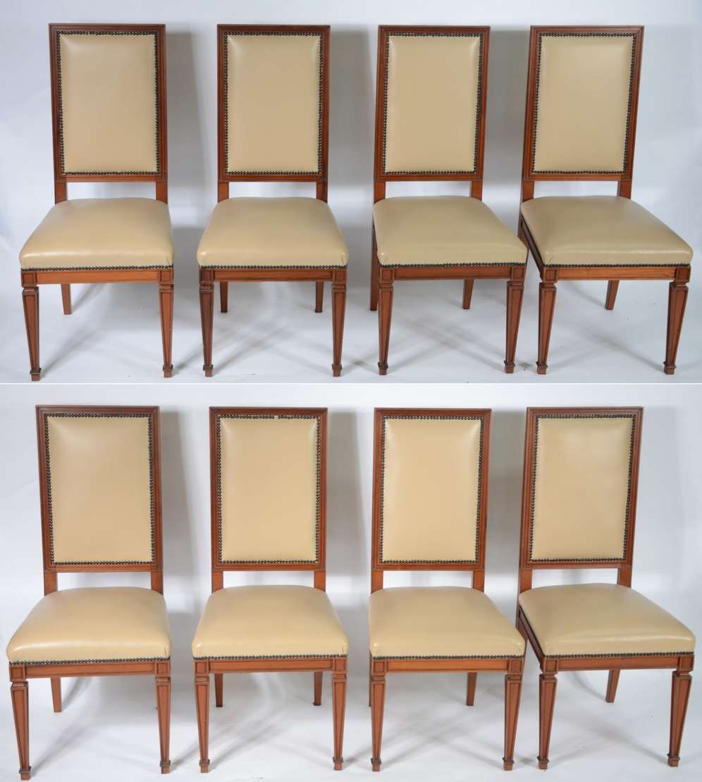 Conjunto com 4 cadeiras de madeira nobre para sala de jantar, estofadas e forradas com tecido bege estampado e tachea...