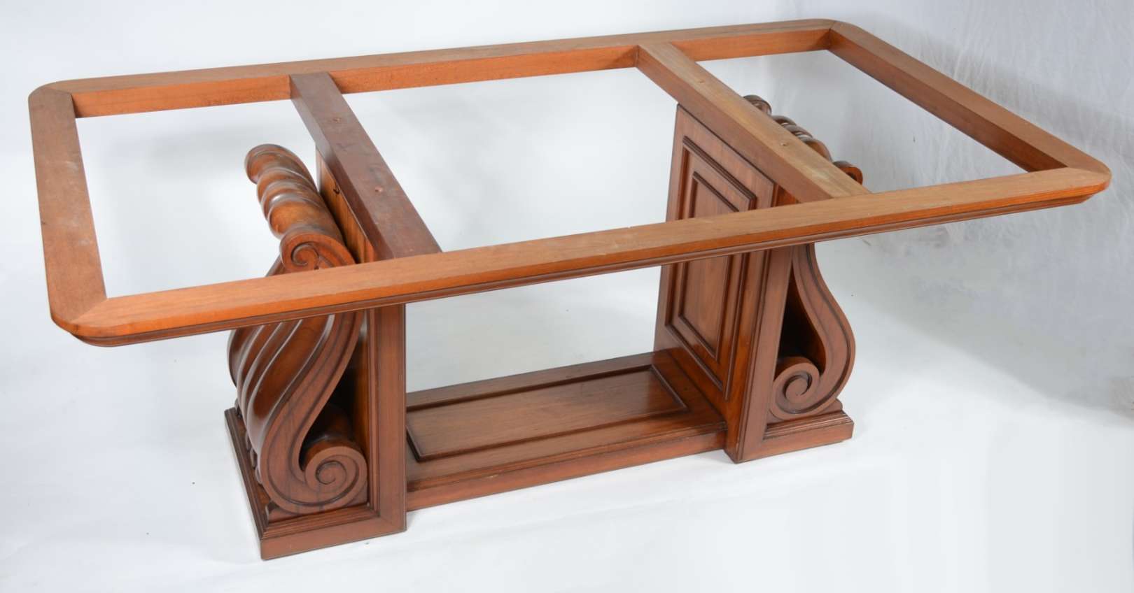 Mesa de centro com duas bases quadrangulares de madeira, detalhes entalhados, tampo de mármore.