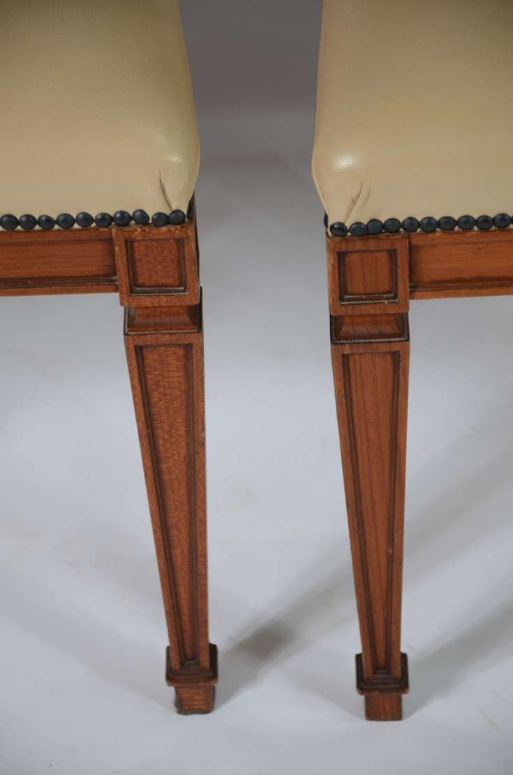 Par de cadeiras com braços de madeira nobre, assentos estofados e encostos de palhinha, pernas cilíndricas frisadas.
