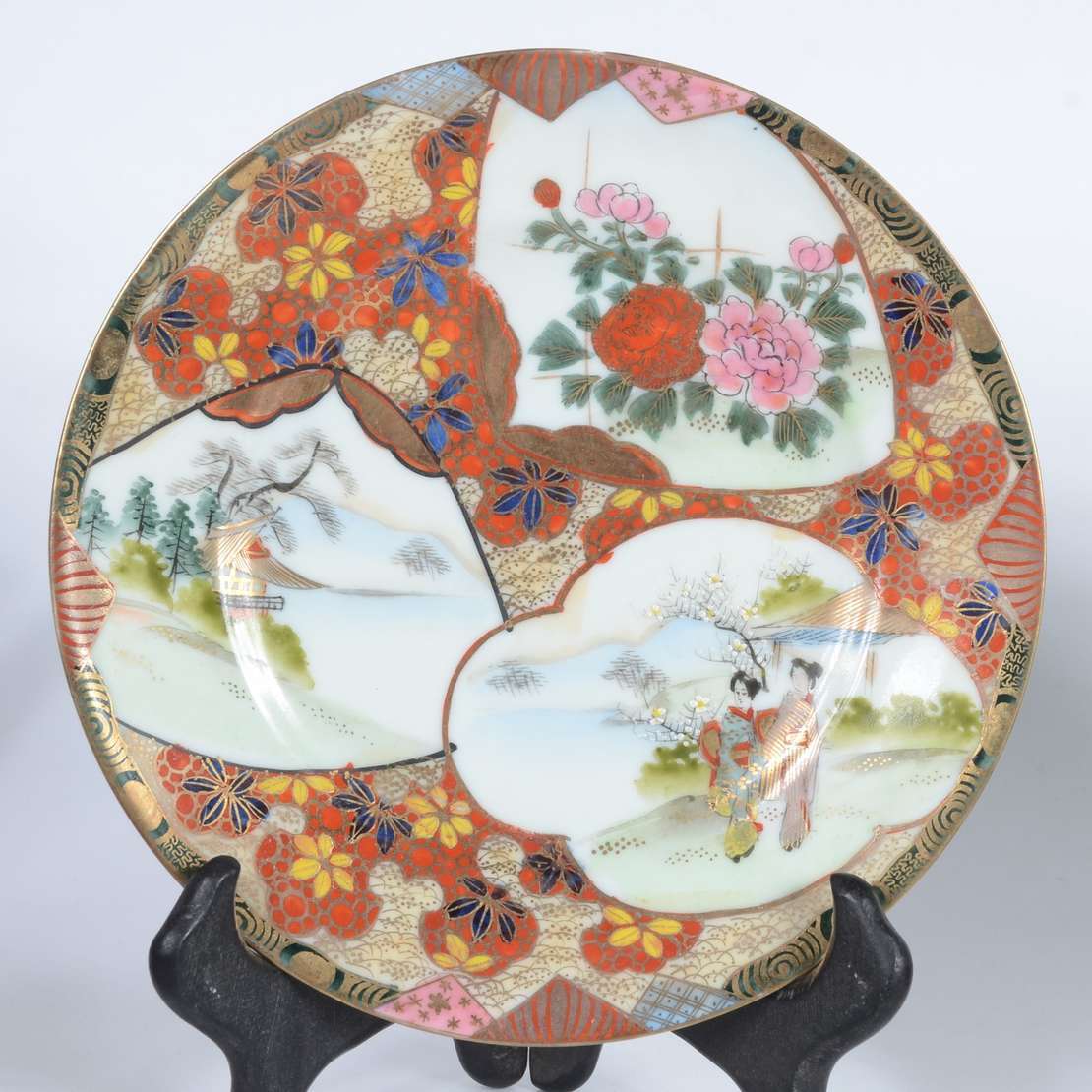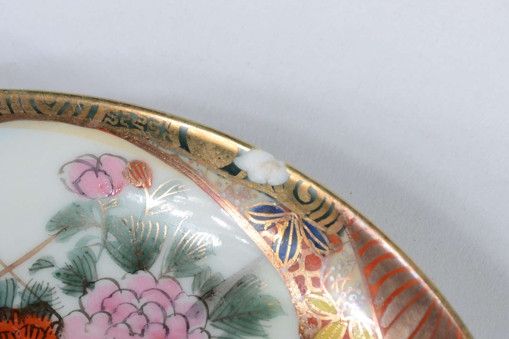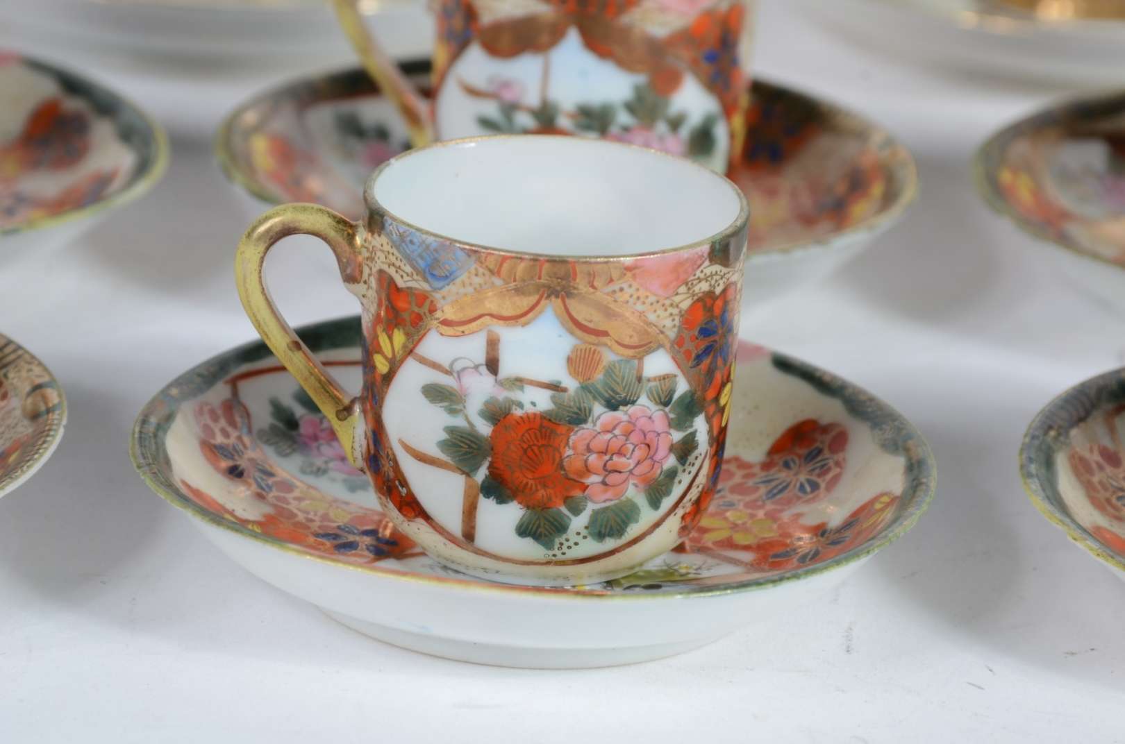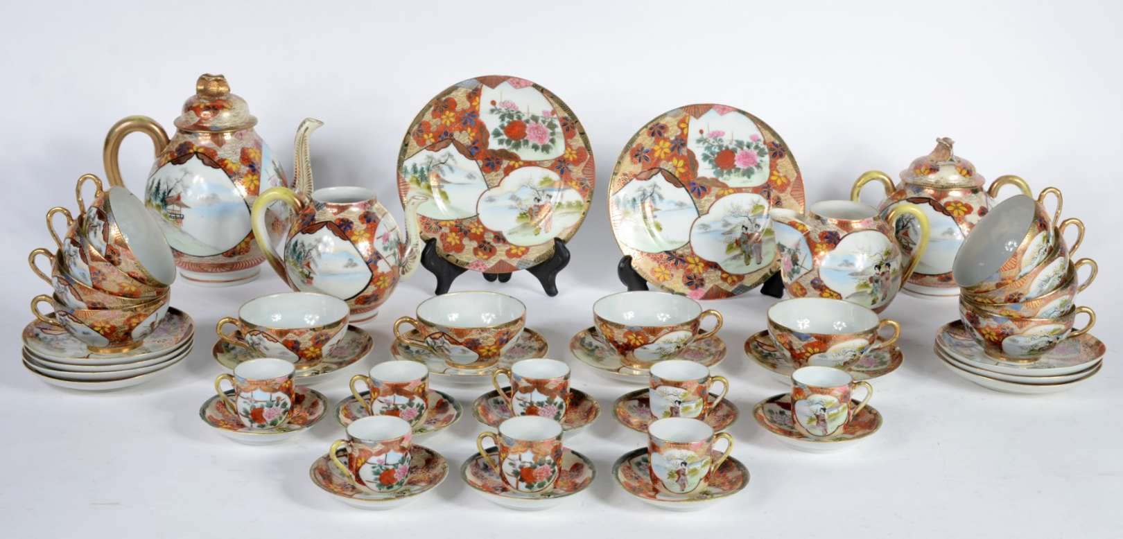 Aparelho de chá e café de porcelana oriental, decorado com figuras de gueixas e flores em policromia e realces dourados, composto de: 11 xícaras de chá com pires, 8 xícaras de café com pires, 2 bules (um sem tampa e outro com pequeno bicado na parte interna da tampa), leiteira (sem tampa), açucareiro e 2 pratos para bolo. Total: 26 peças.