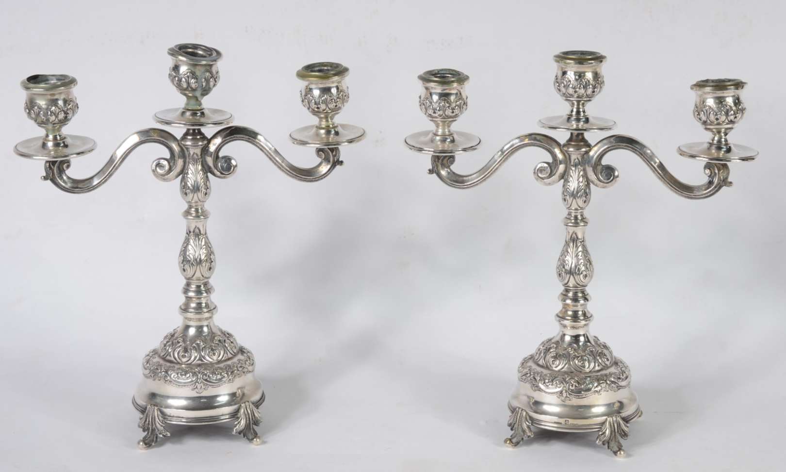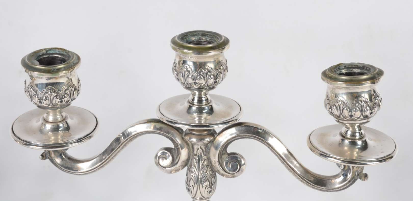 Par de castiçais de prata inglesa contrastada. Peso total com enchimento: 990 g. (Por motivos de segurança a peça não...