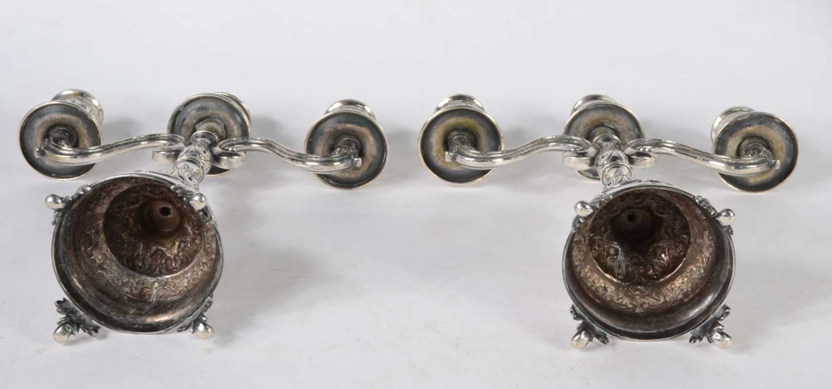 Par de castiçais de prata contraste 833 mls, decorado com concheados cinzelados, pés de garra. Peso da prata: 500 g. ...