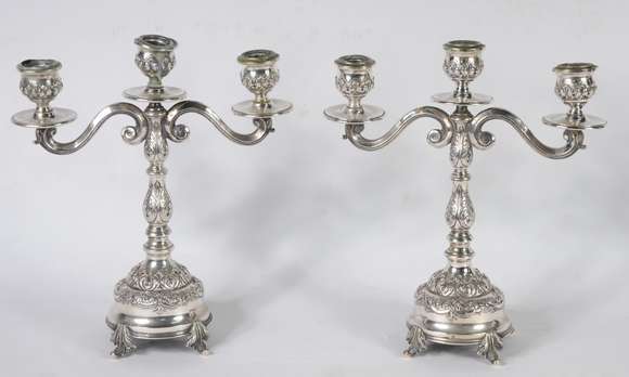Par de candelabros de prata contraste 833 mls para 3 velas cada, trabalhados com concheados e palmas em relevo. Parte...