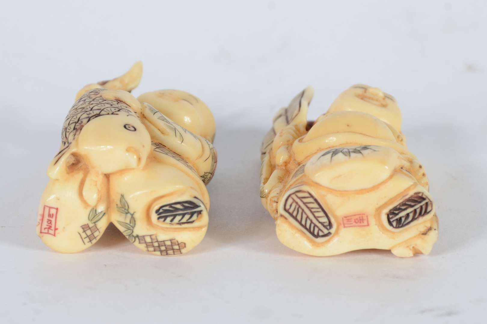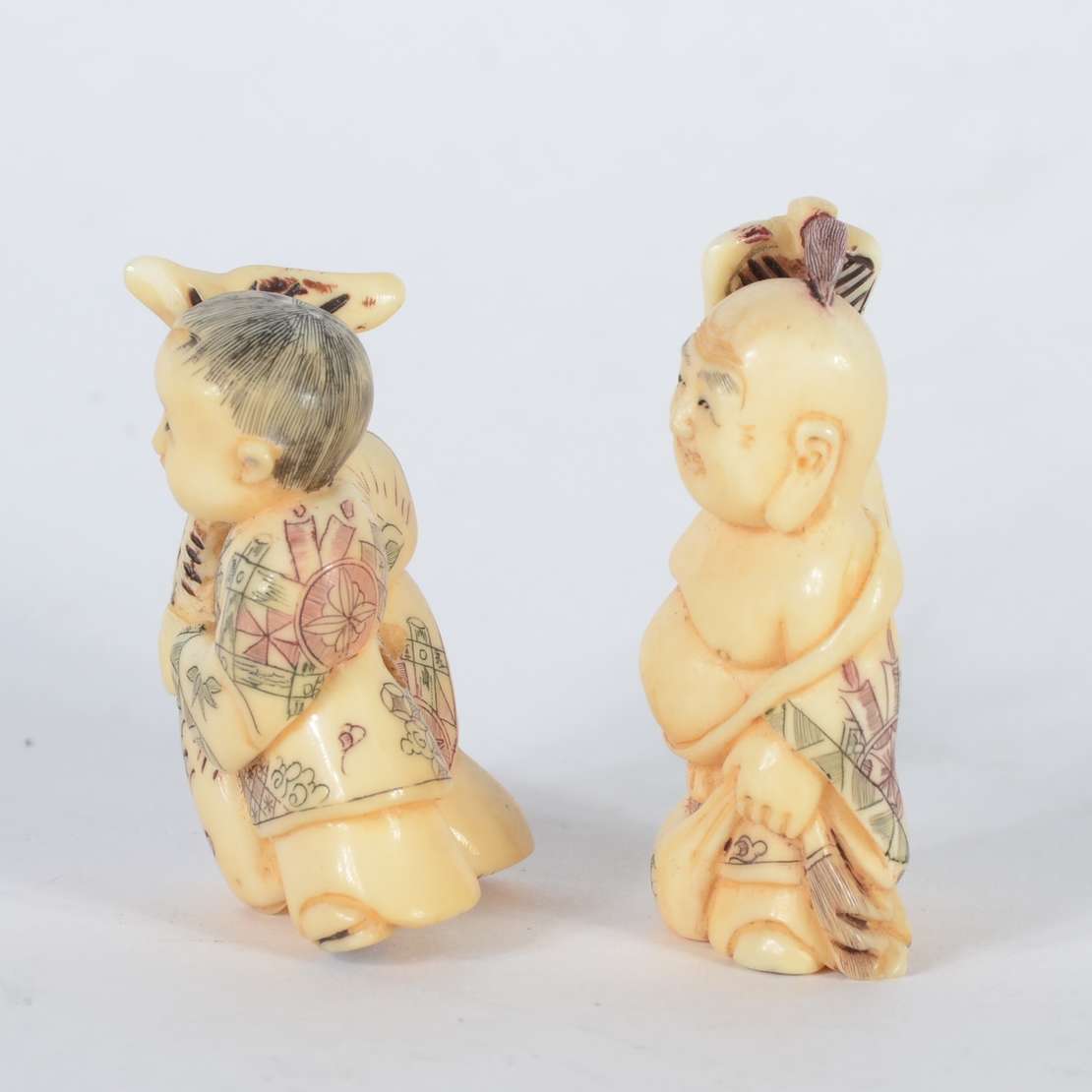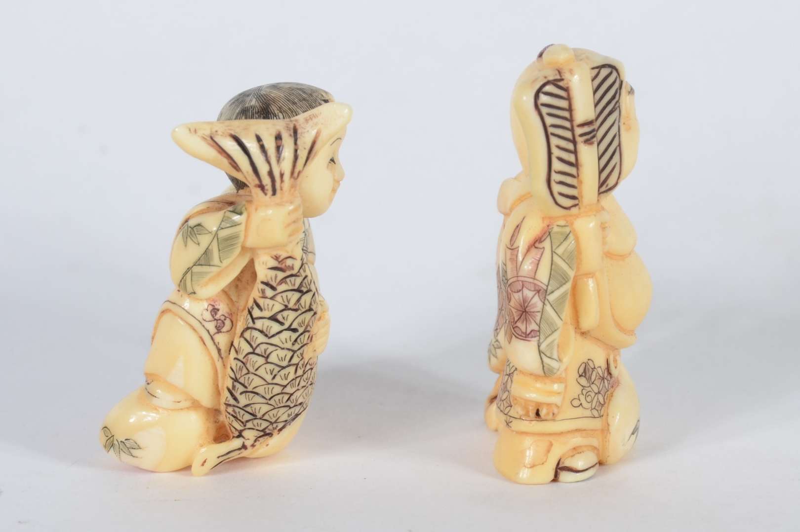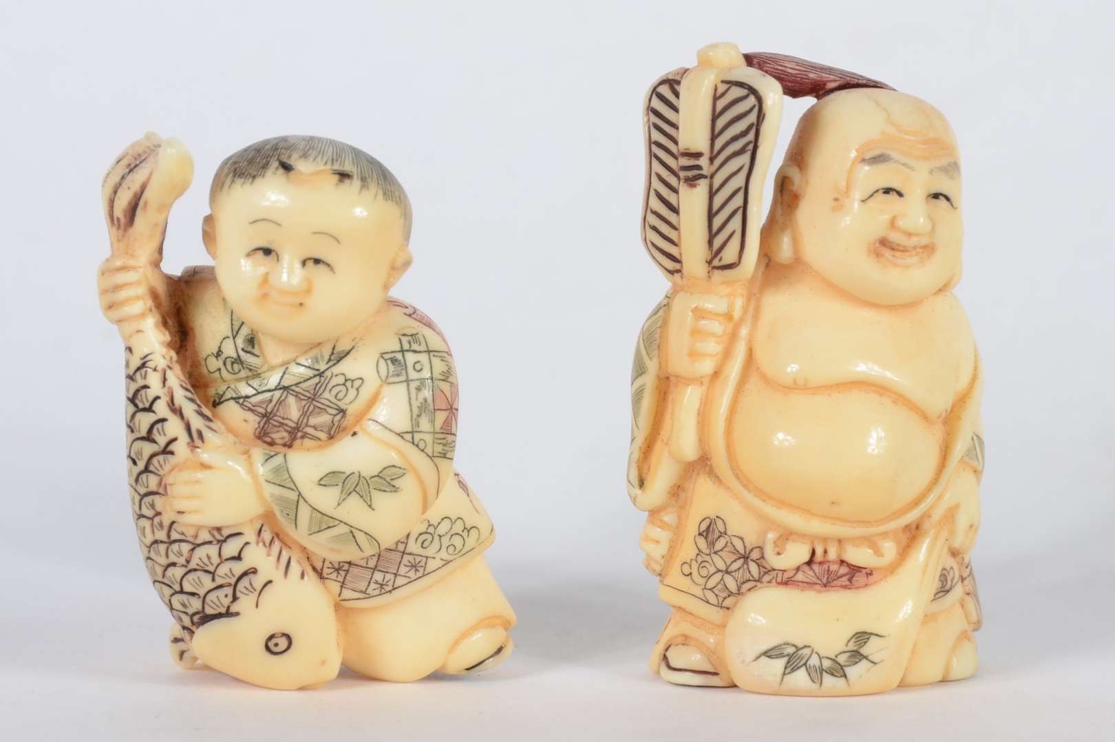 Dois netsukes de marfim oriental policromado representando figura masculina com peixe e jovem segurando coelho. Bases...
