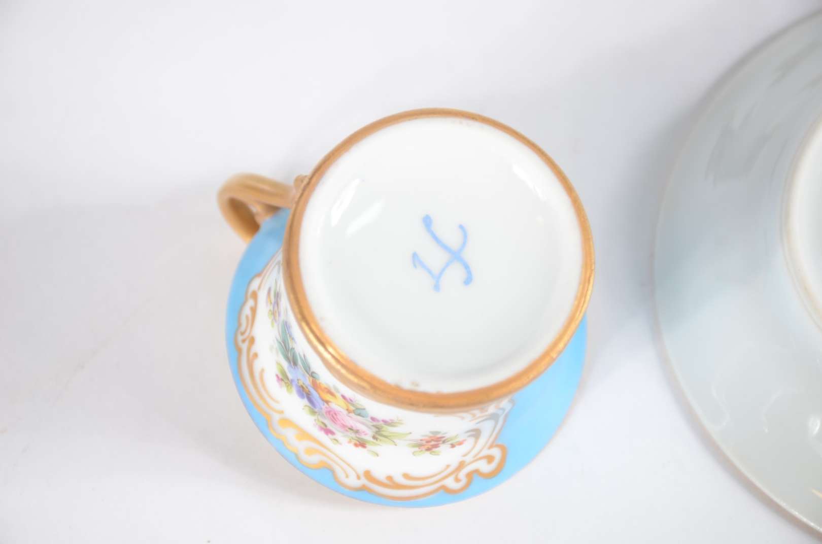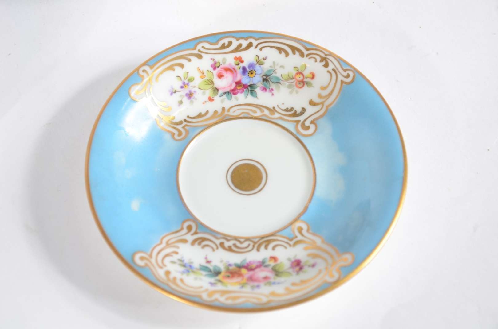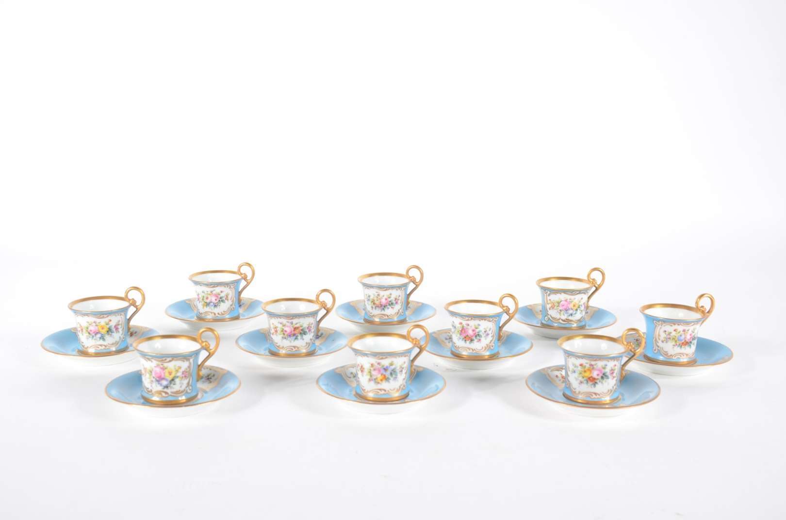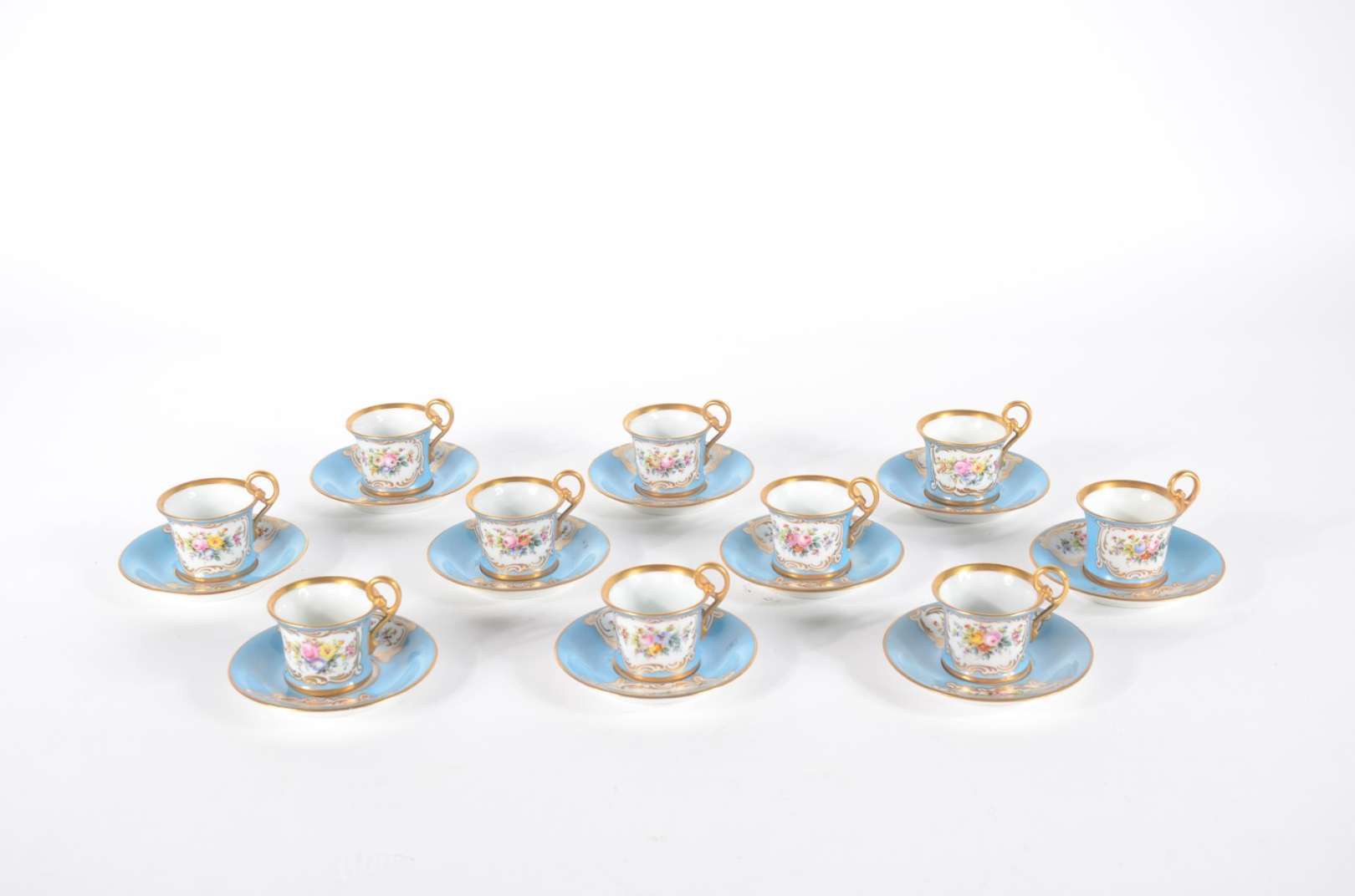 Conjunto com 10 xícaras para café com pires de porcelana francesa azul turquesa com flores em policromia e realces dourados.