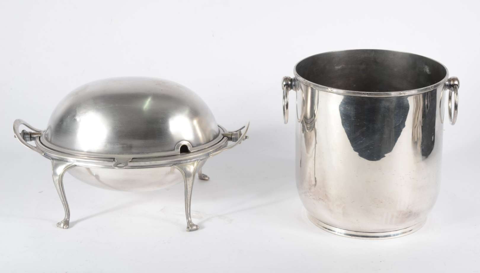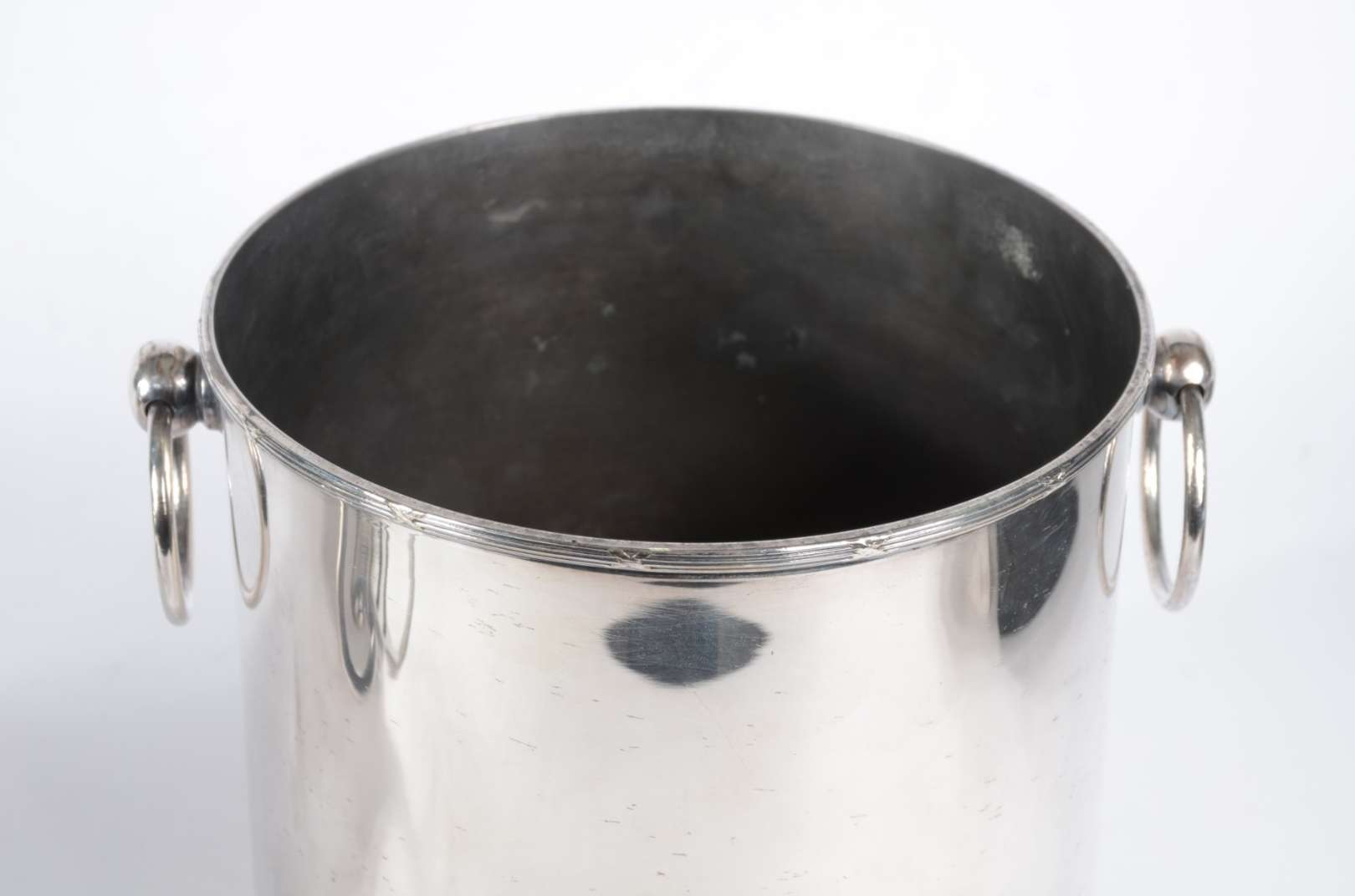 Diversas peças de metal prateado, sendo: dois copos, porta guardanapos e conjunto infantil. Nos estojos.