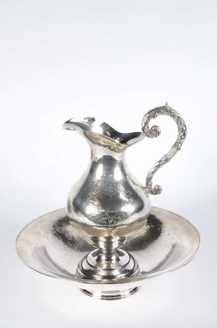 Serviço para chá/café de prata Sterling 925 mls, composto de: bule, leiteira e cesta, alças com trabalhos gomados. Pe...