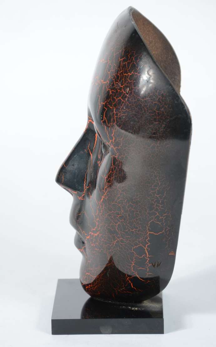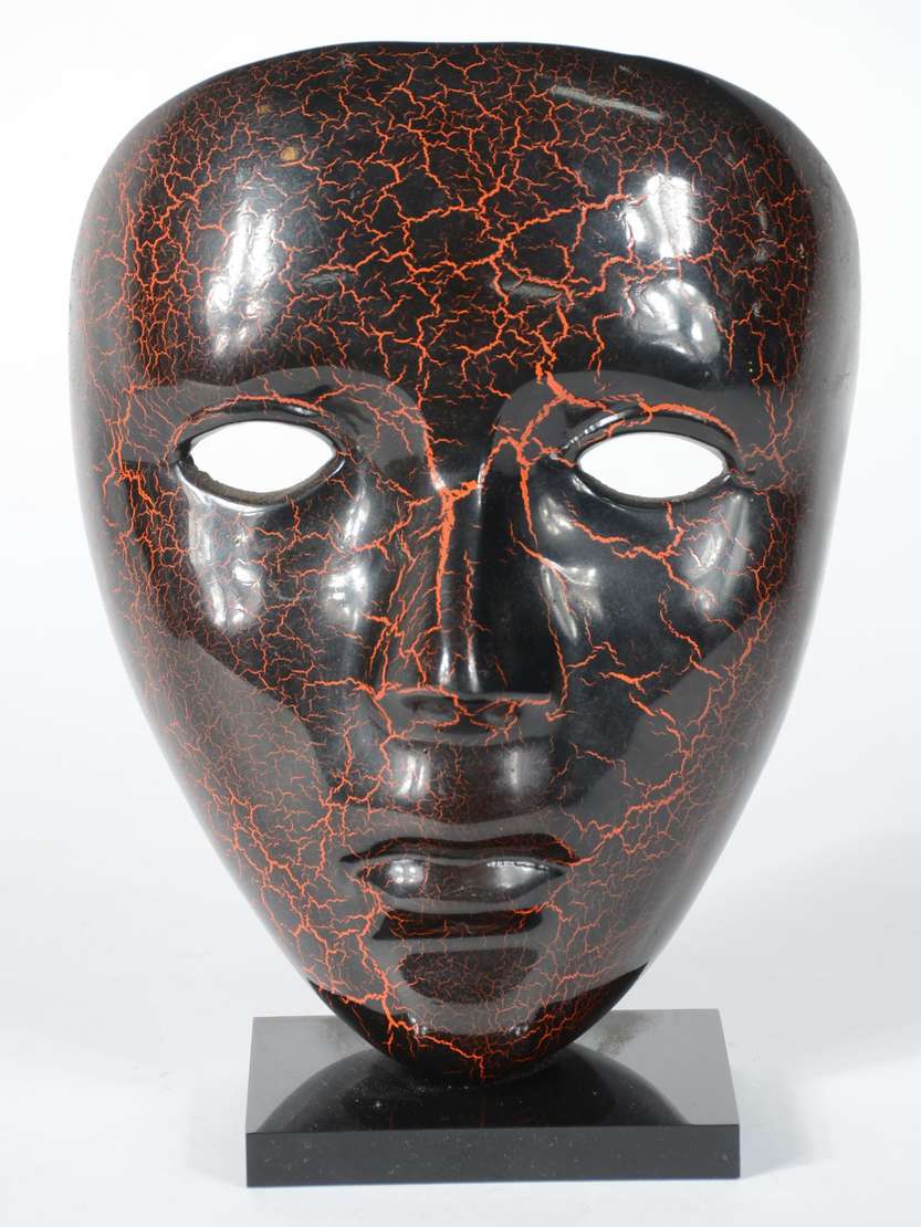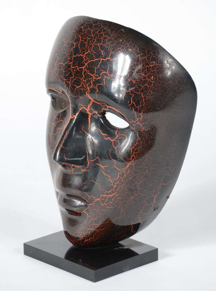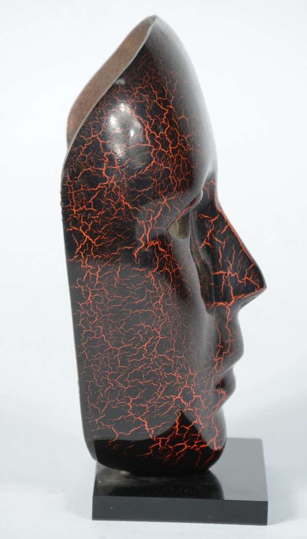 Escultura de bronze patinado na forma de máscara.