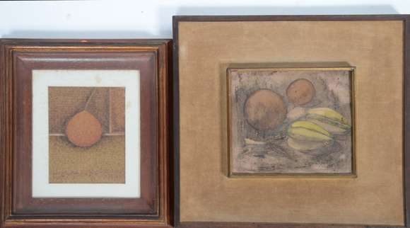 Par de gravuras com figuras geométricas, pontos de fungos.