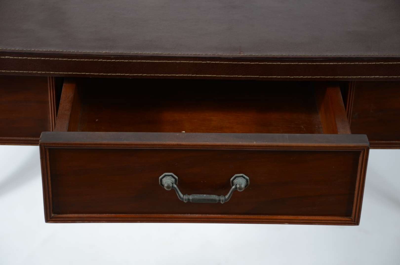Mesa de jantar em madeira nobre, tampo retangular com 6 gavetas, sendo 3 para cada lado, apoio em pernas laterais rec...