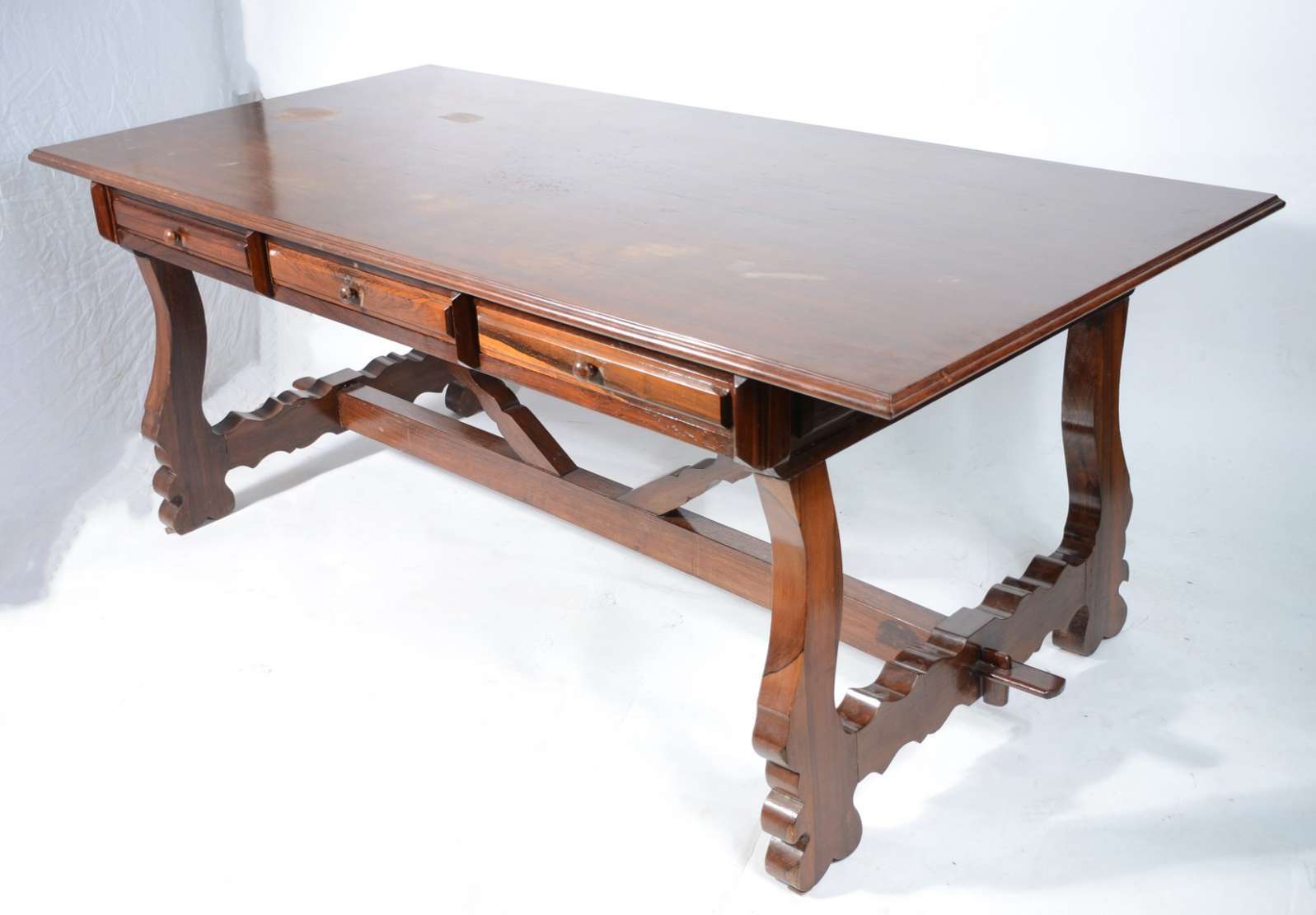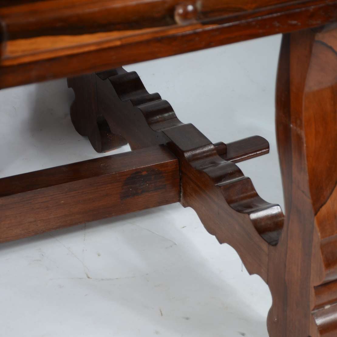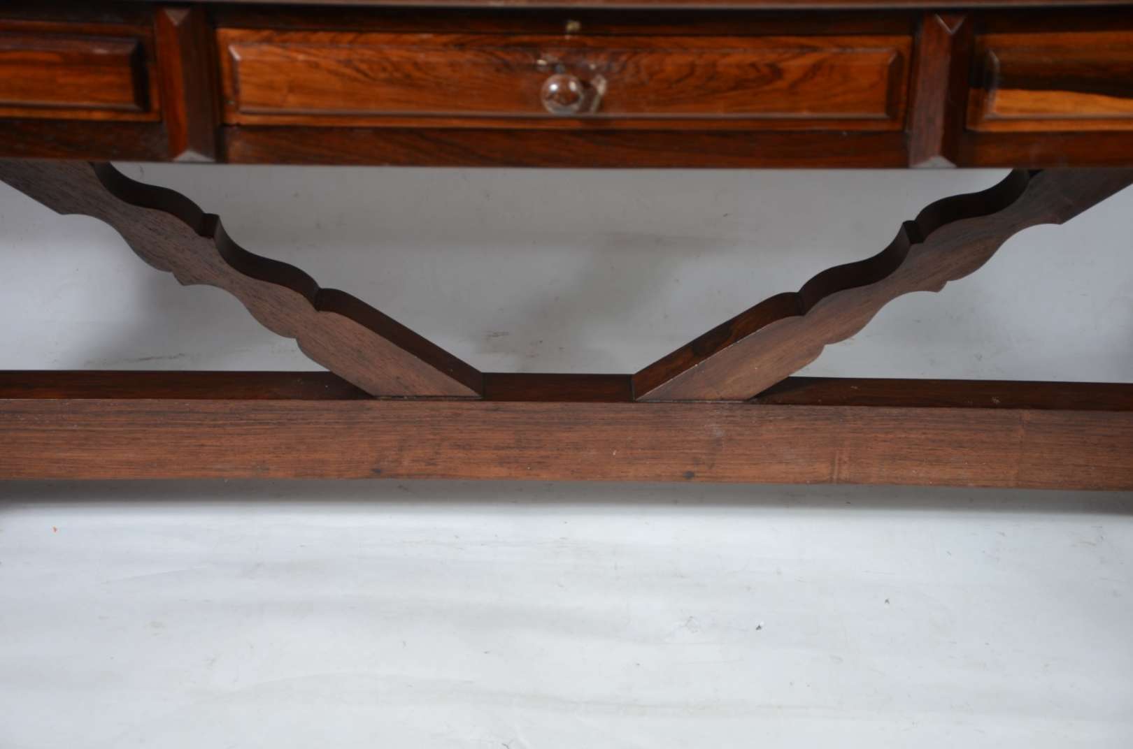 Aparador de madeira nobre, saia recortada, pernas arqueadas e ligadas por traves inferiores arrematada com florão cen...