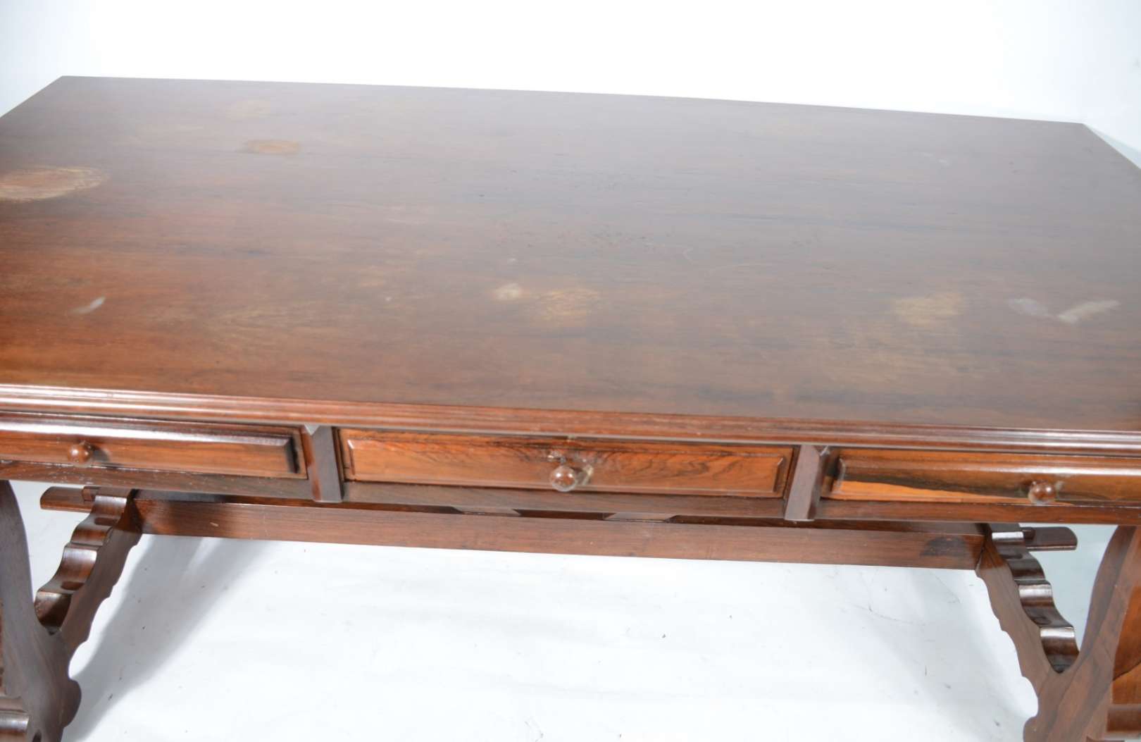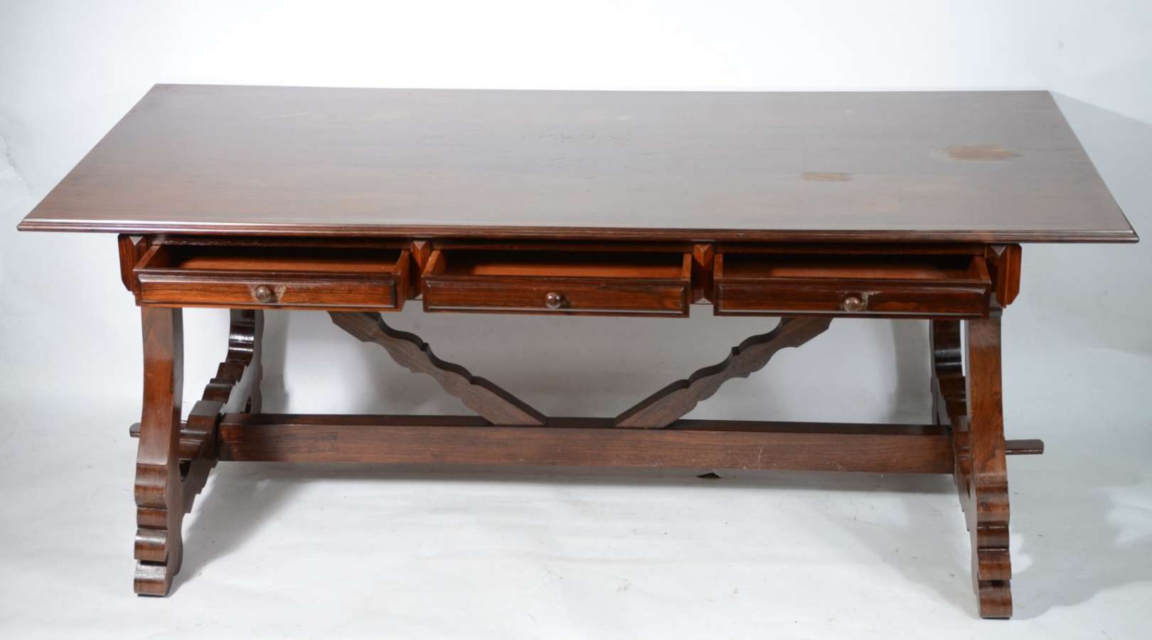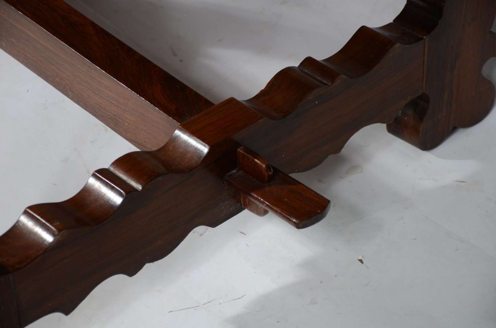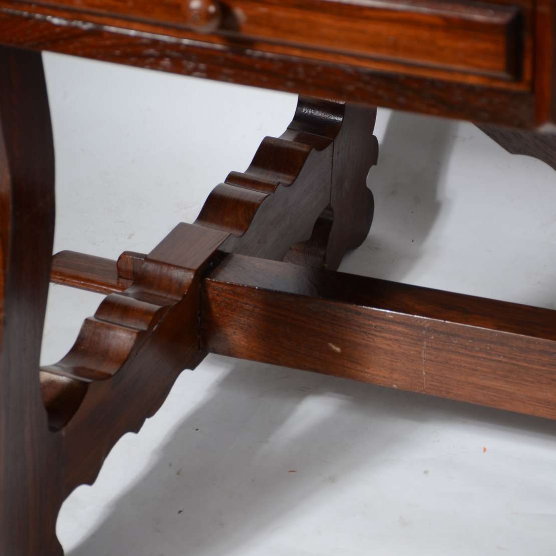 Aparador de madeira nobre, saia recortada, pernas arqueadas e ligadas por traves inferiores arrematada com florão cen...