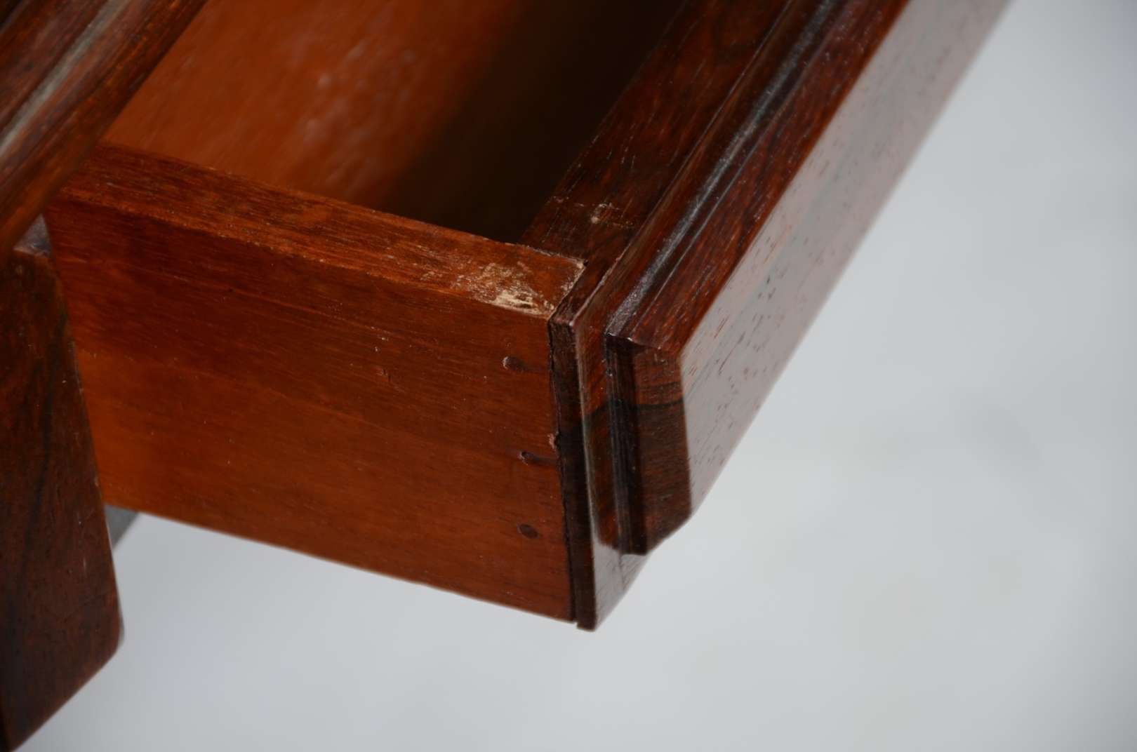 Baú de madeira nobre, tampo articulado, frente com "losango" em relevo.