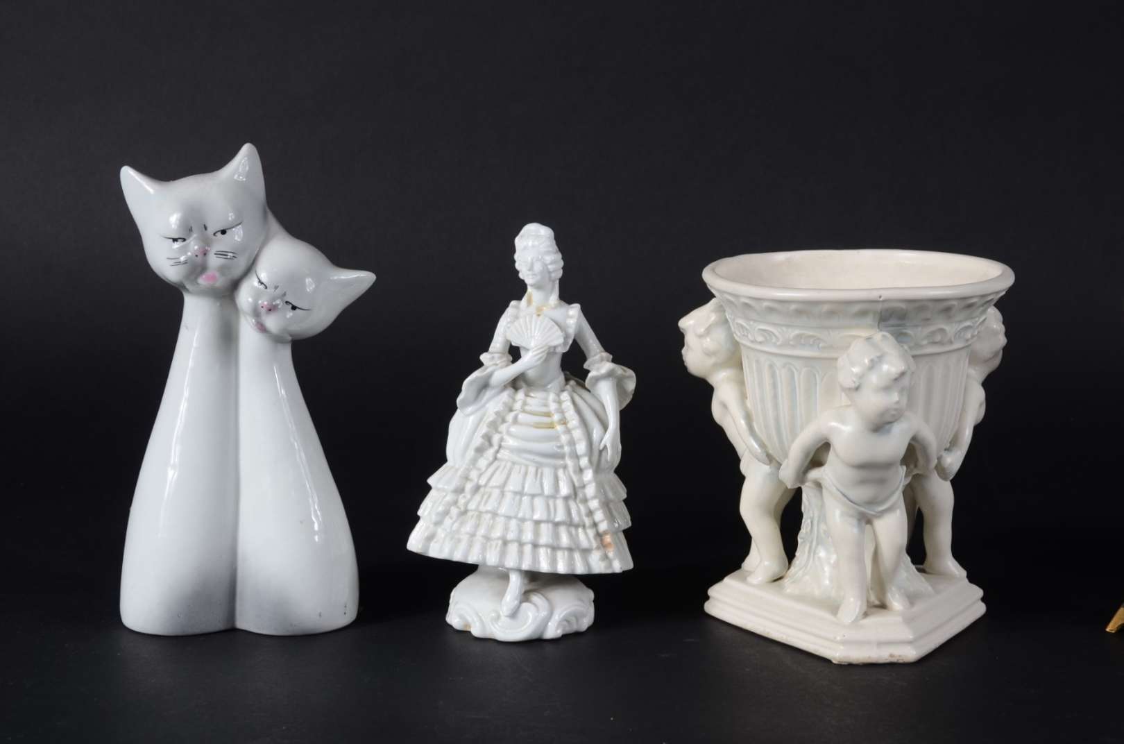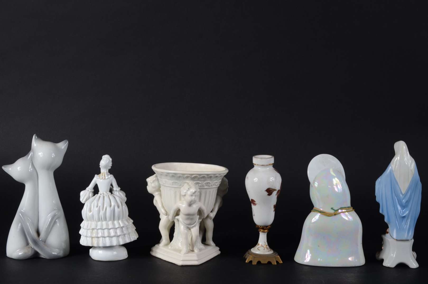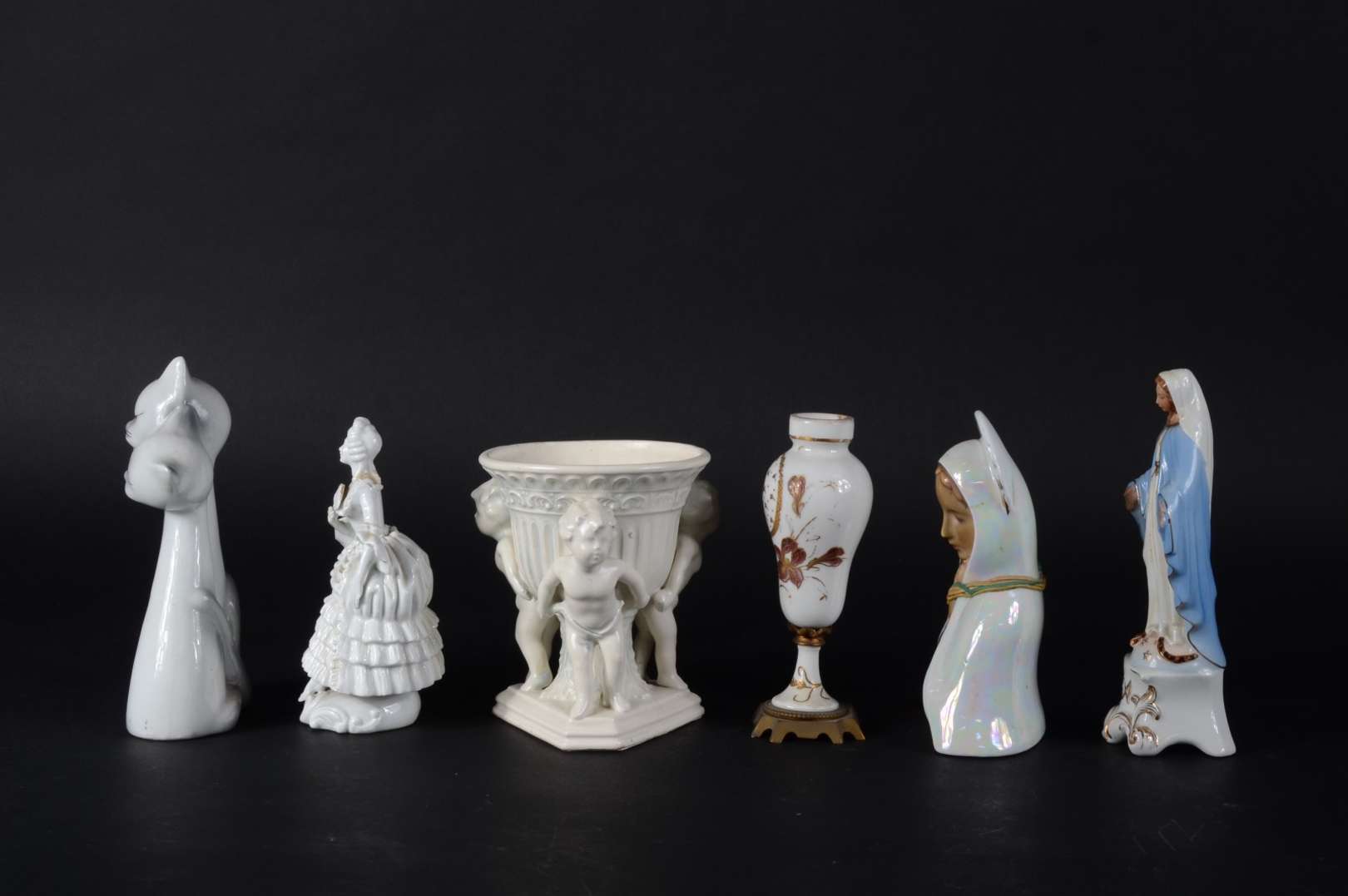 Cinco peças diversas, sendo: 2 estatuetas de porcelana; escultura de cristal representando galo; ovo de porcelana pol...