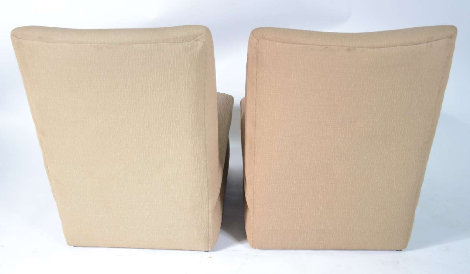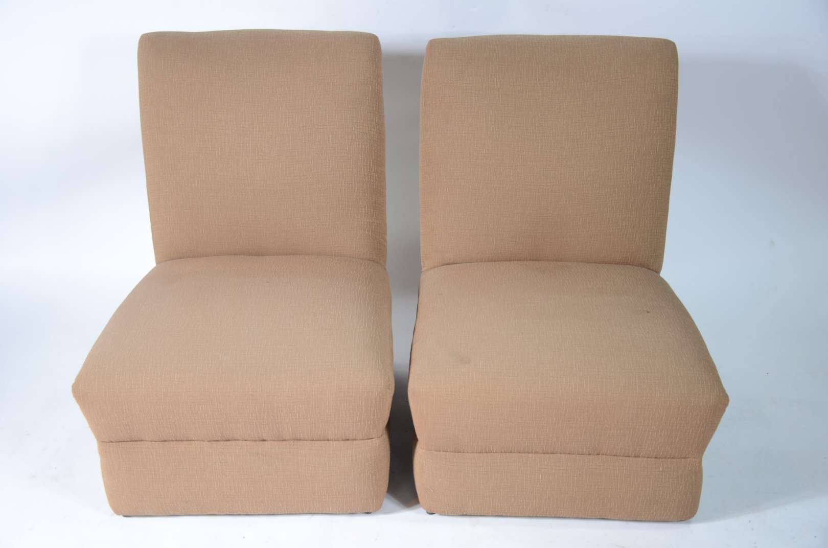 Par de cadeiras de madeira laqueada em tom rosado com estofamento forrado com tecido listrado.