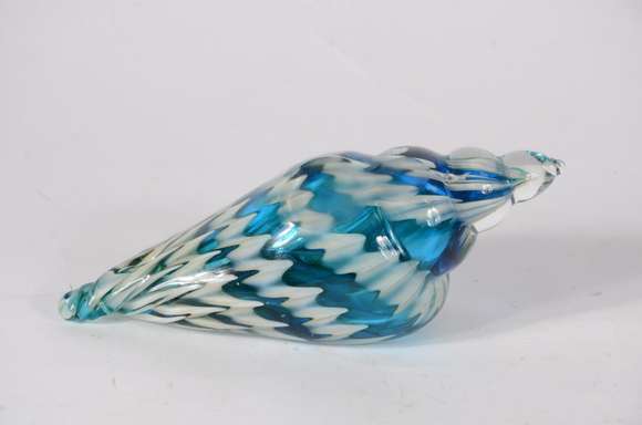 Escultura de vidro no estilo murano em tons de azul e bege representando caramujo.