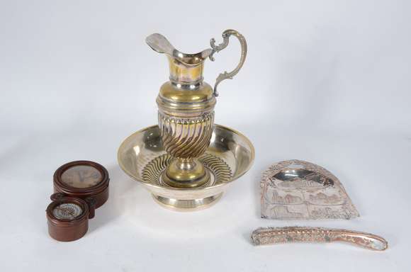 Diversas peças, sendo: gomil com bacia e cata migalhas com escova de metal prateado (desgastes no metal); e, pequeno ...