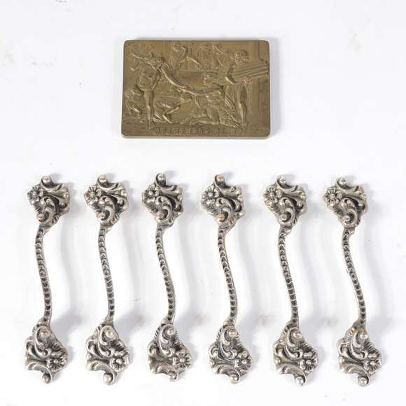 Conjunto de 6 descansos de talheres de metal prateado e pequena placa de bronze. Total 7 peças.
