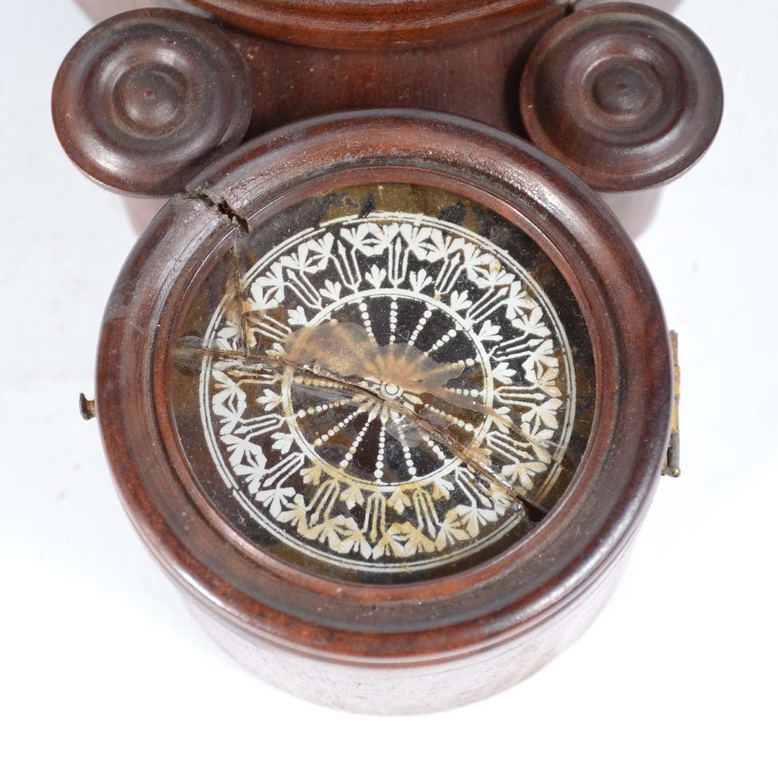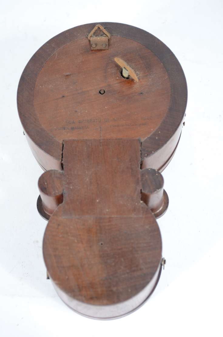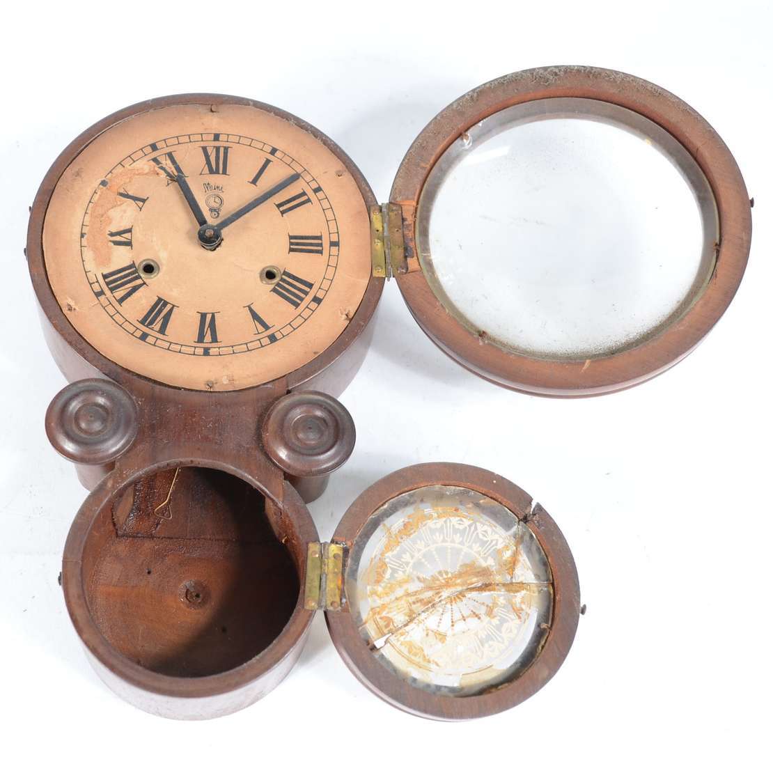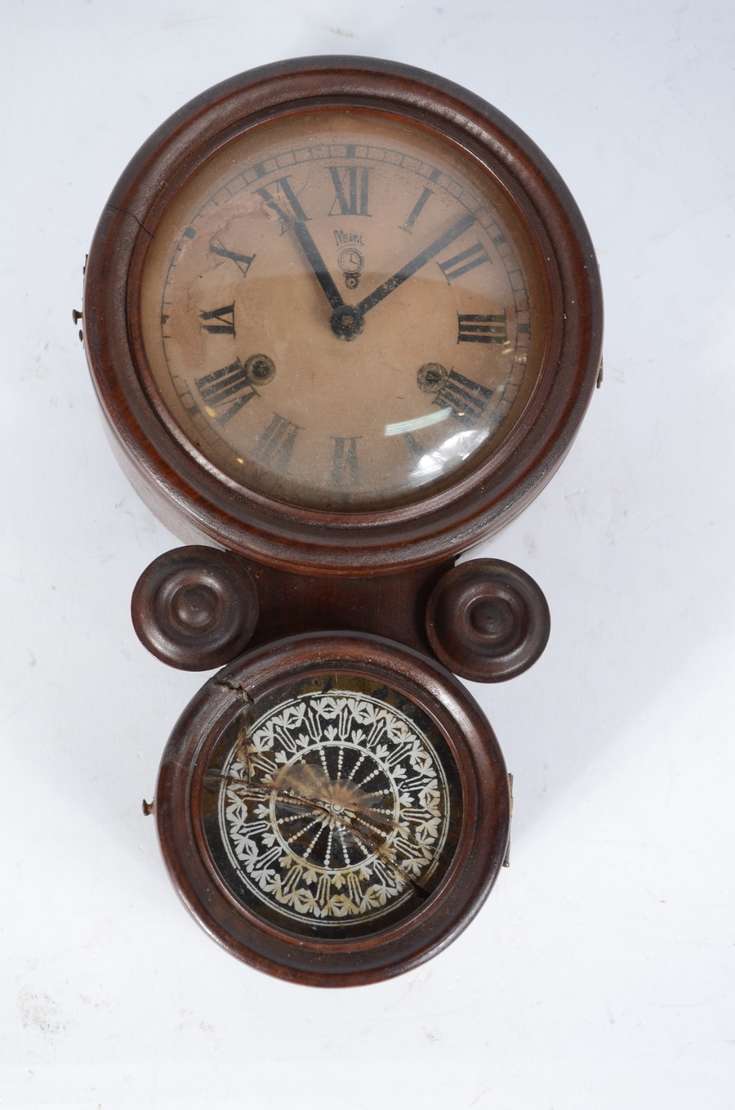 Relógio de parede com caixa de madeira, detalhes torneados. Faltando acabamento na parte inferior. Desgastes no mostr...