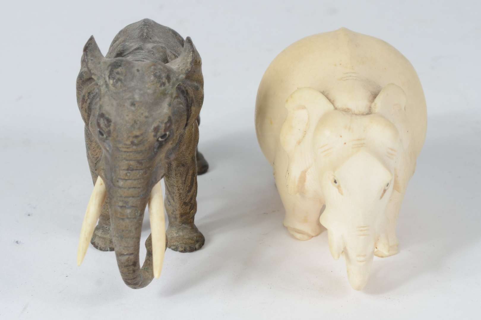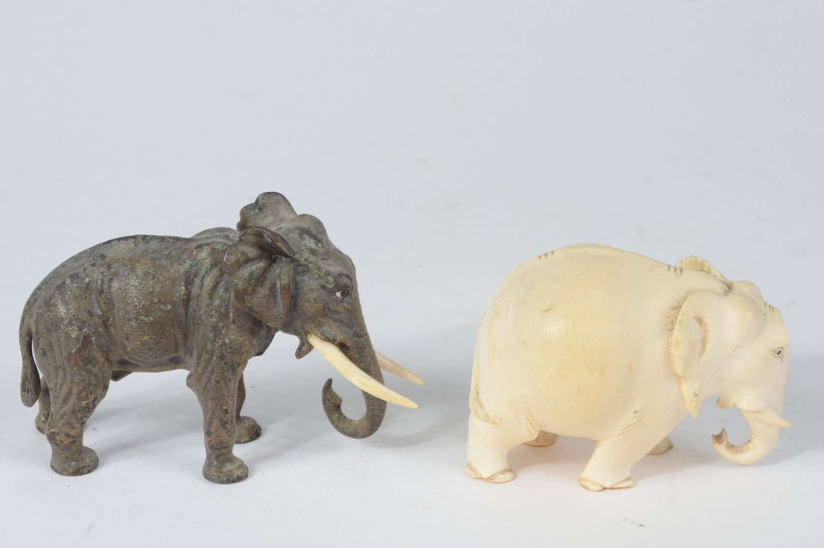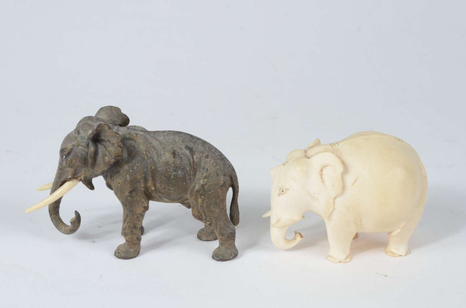 Duas pequenas esculturas representando elefantes, sendo uma de marfim e outra de bronze com presas de marfim.