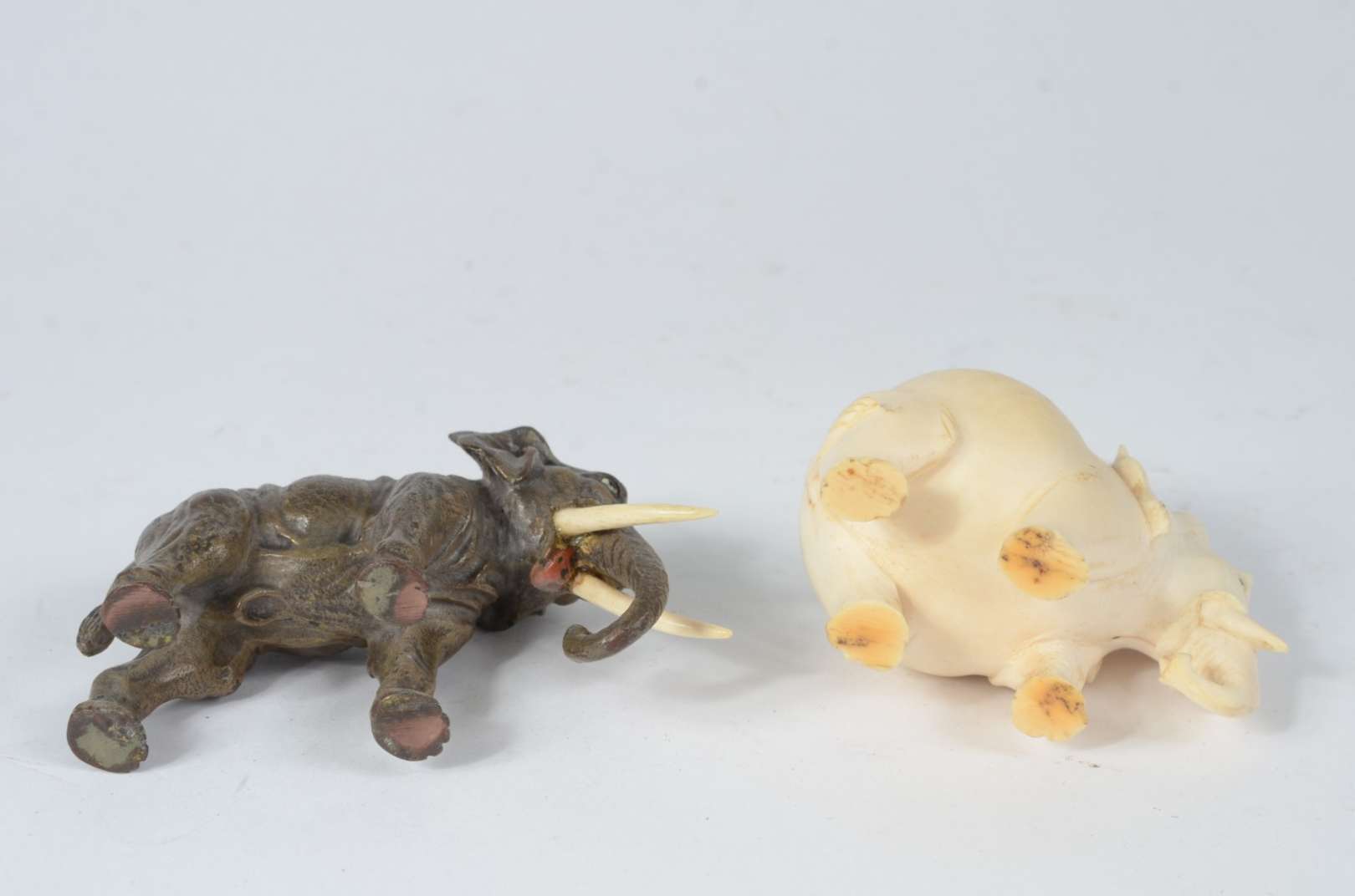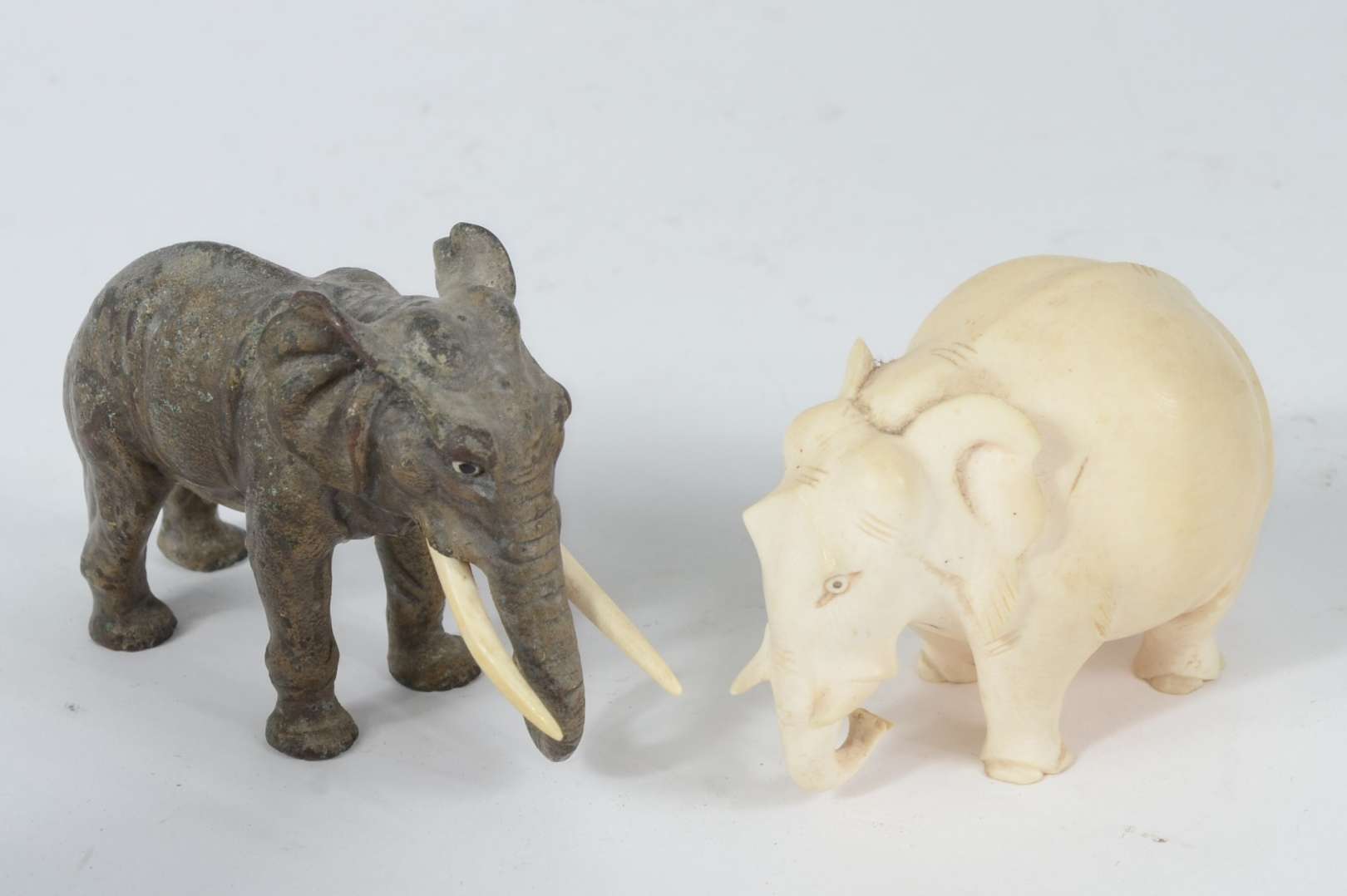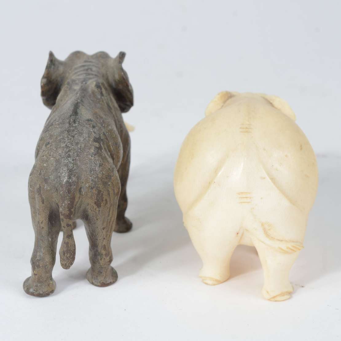 Duas pequenas esculturas representando elefantes, sendo uma de marfim e outra de bronze com presas de marfim.