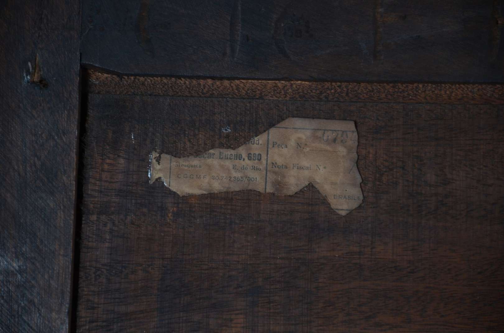 Mesa bar de madeira nobre, base feitio cavalete e bandeja removível com alças de metal dourado. Desgastes.