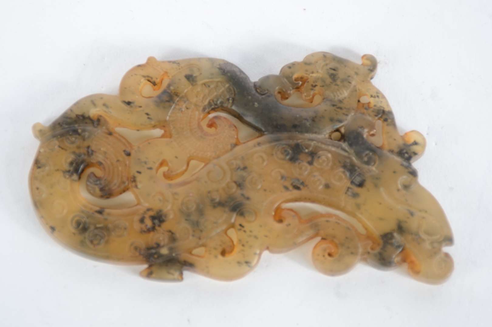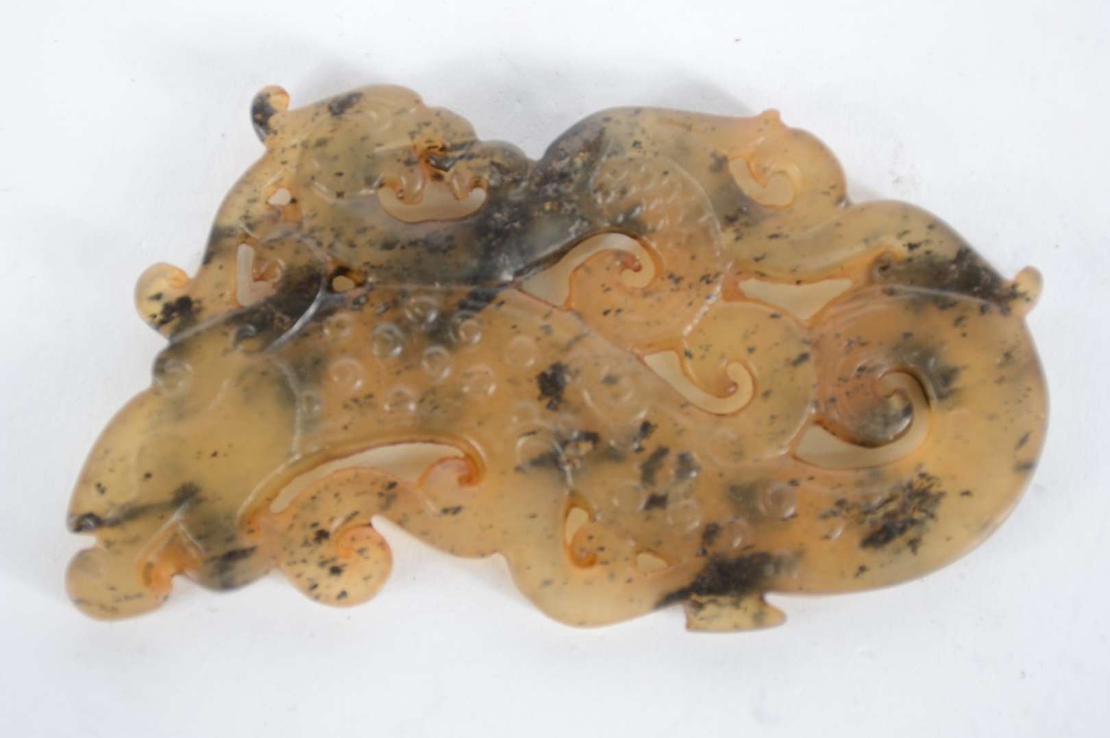 Antiga e rara escultura chinesa em placa de jade de tonalidades marrom, representando cavalo marinho gravado com esti...