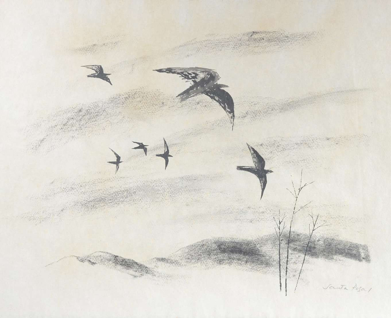 Gravura aquarelada, assinada. Papel com defeitos nas bordas. Pequenas manchas.