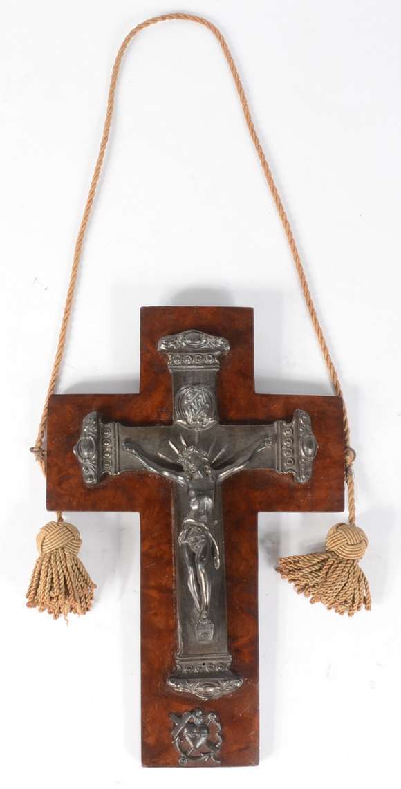 Crucifixo de madeira com figura de Cristo crucificado em metal.