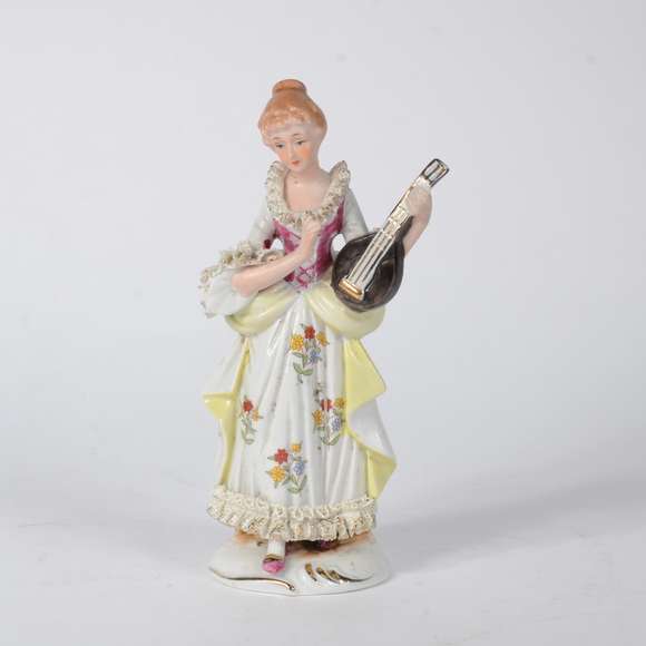 Estatueta de porcelana policromada representando jovem com instrumento de cordas.