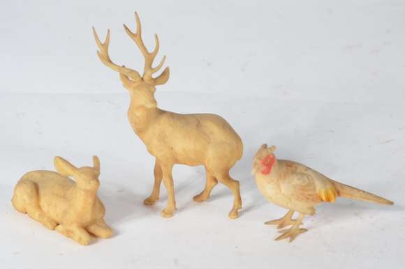 Três pequenas esculturas representando animais, material não identificado.