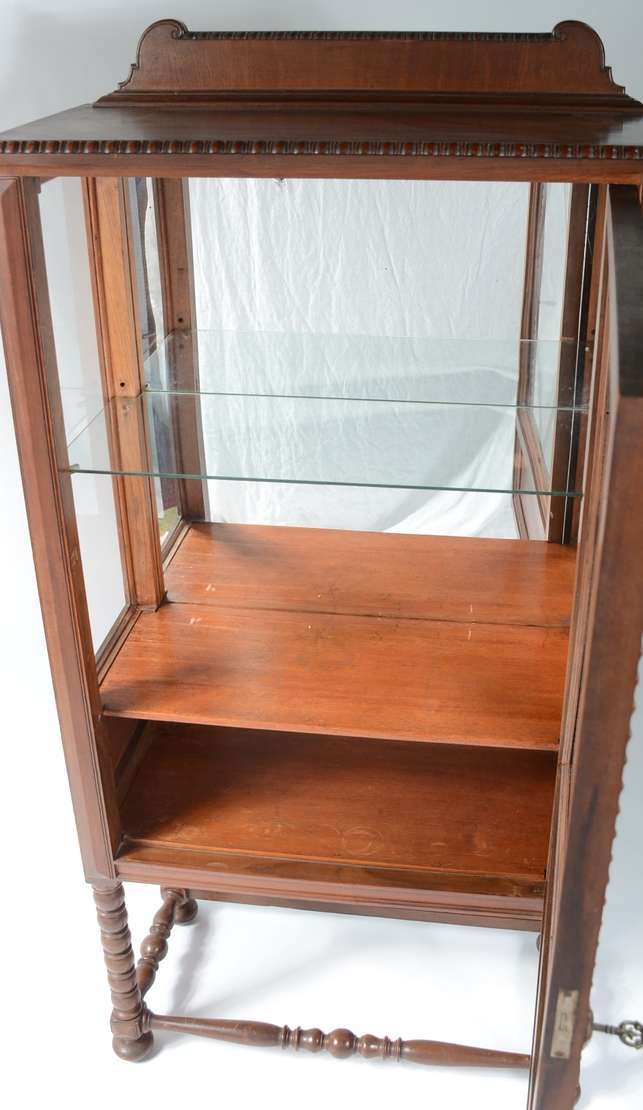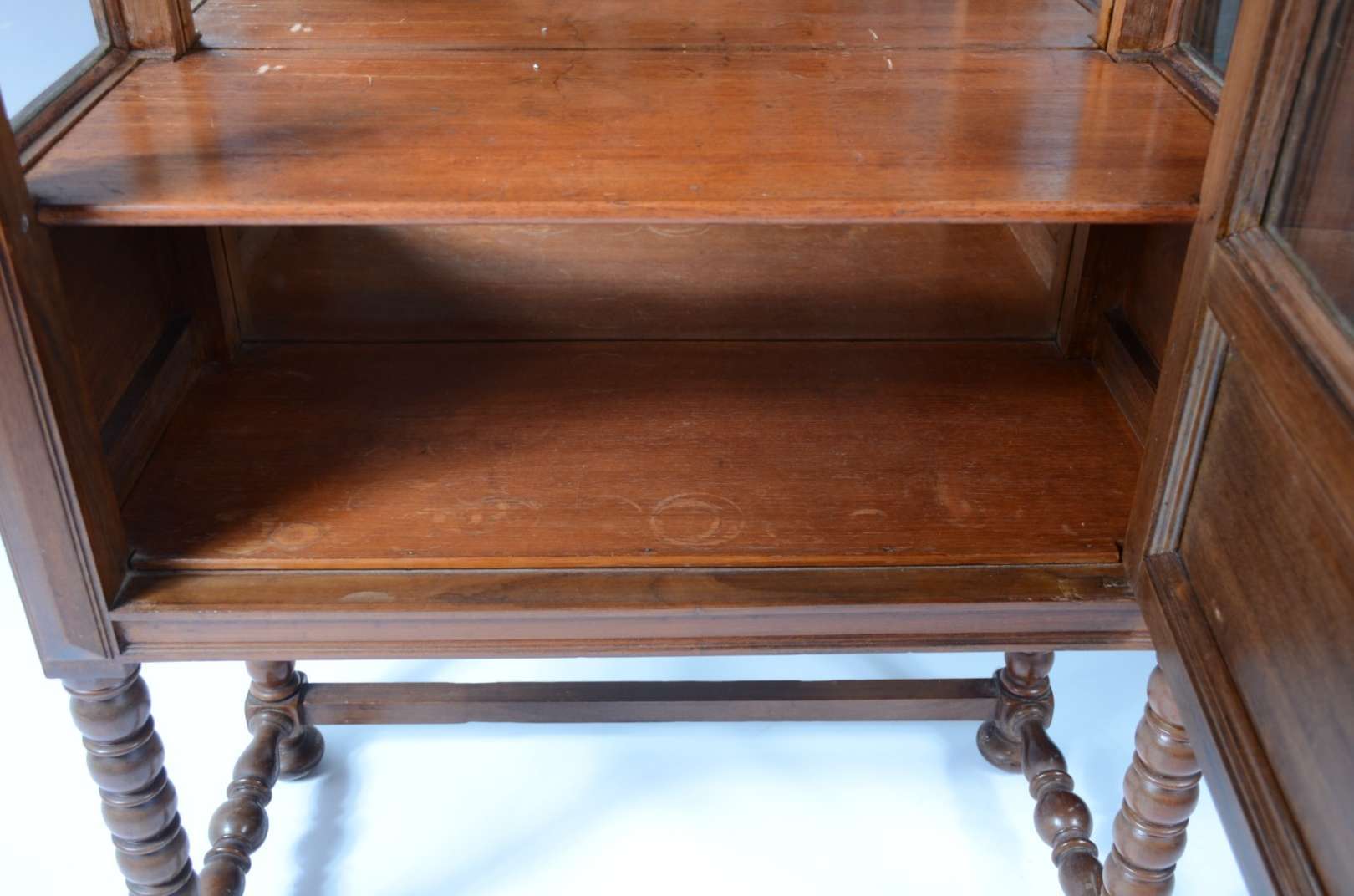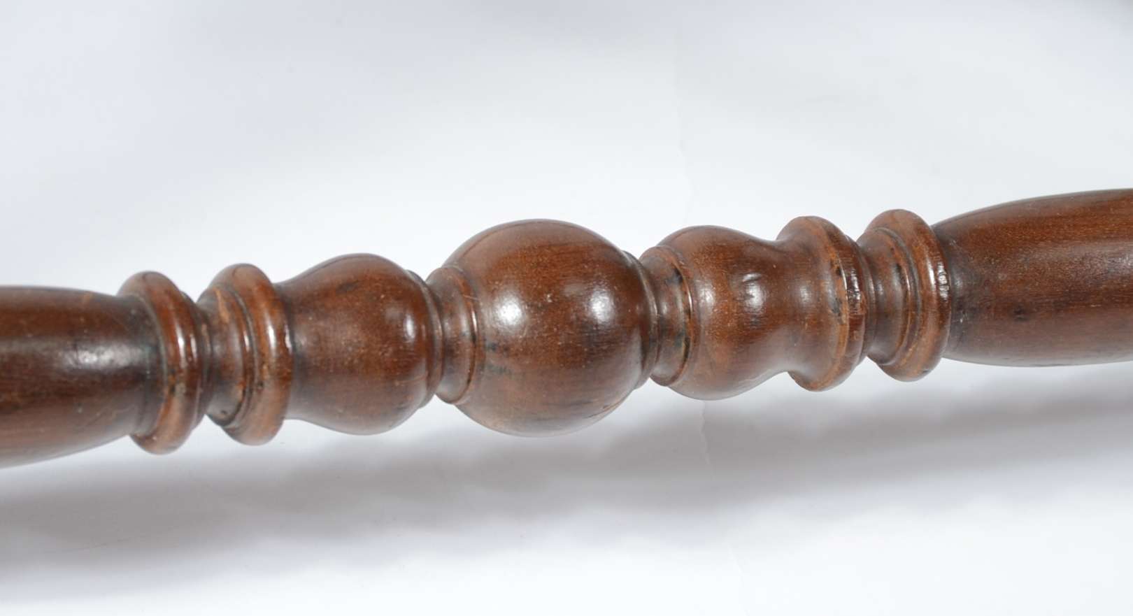 Mesa auxiliar de madeira nobre, platô inferior ligados por pernas cilíndricas frisadas.