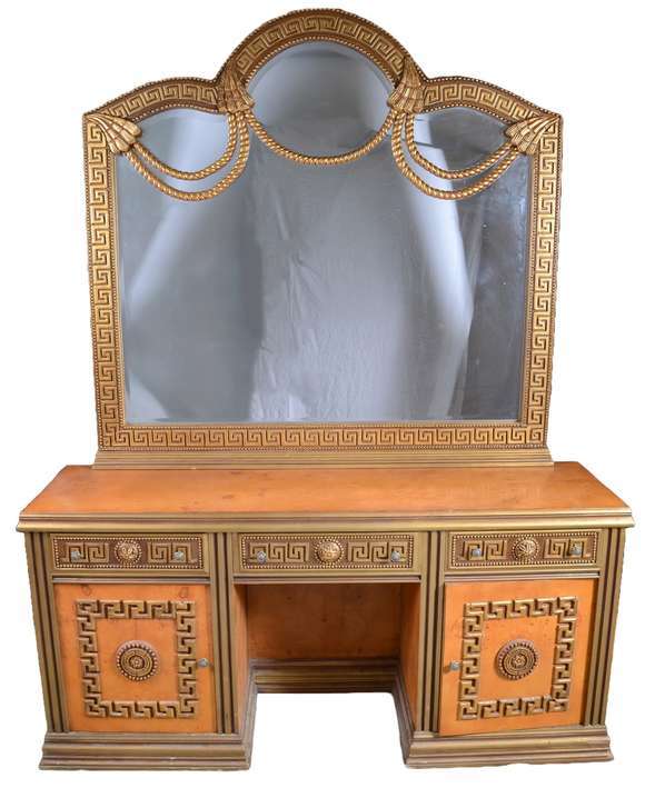 Movel penteadeira de madeira nobre com realces dourados, três gavetas e duas portas com elementos geométricos em rele...
