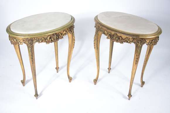 Par de mesinhas laterais de madeira nobre, estilo francês, patinadas em dourado com tampos de mármore, saias com enta...