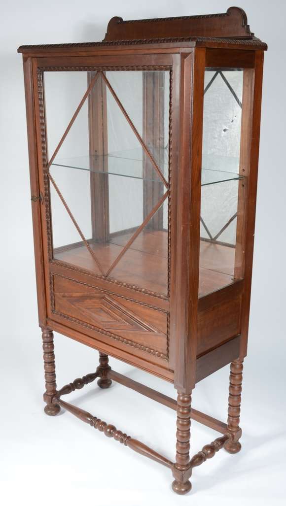 Vitrine de madeira nobre, interior com prateleira uma prateleira de vidro e fundo espelhado e pernas torneados.