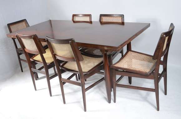 Conjunto de mesa de jantar com tampo retangular e quatro pernas torneadas e 6 cadeiras de jacarandá, assentos curvos ...