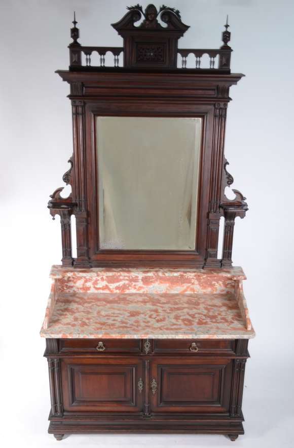 Móvel lavatório de madeira nobre, parte inferior com 2 portas e 2 gavetas almofadadas encimadas por tampo de mármore ...