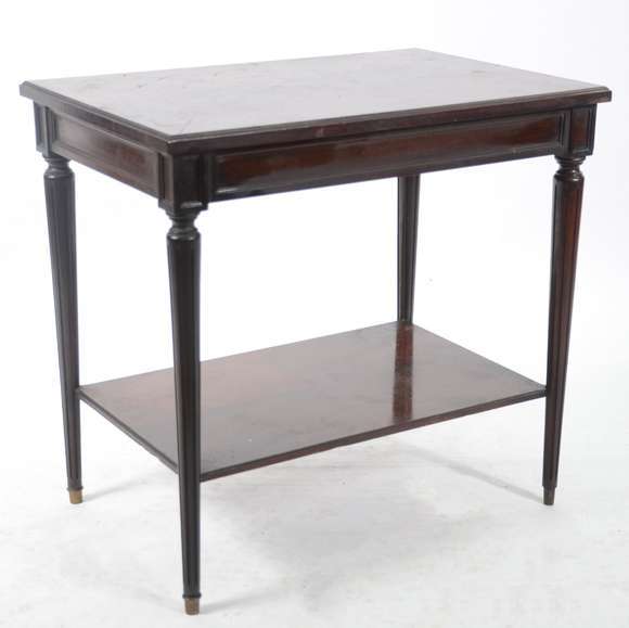 Mesa auxiliar de madeira nobre, platô inferior ligados por pernas cilíndricas frisadas.