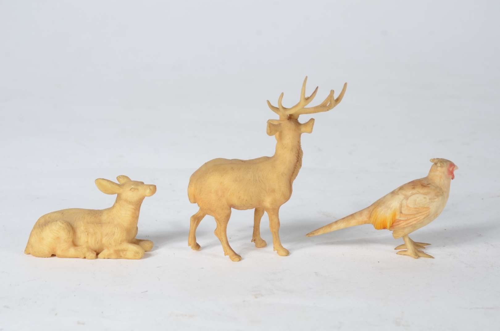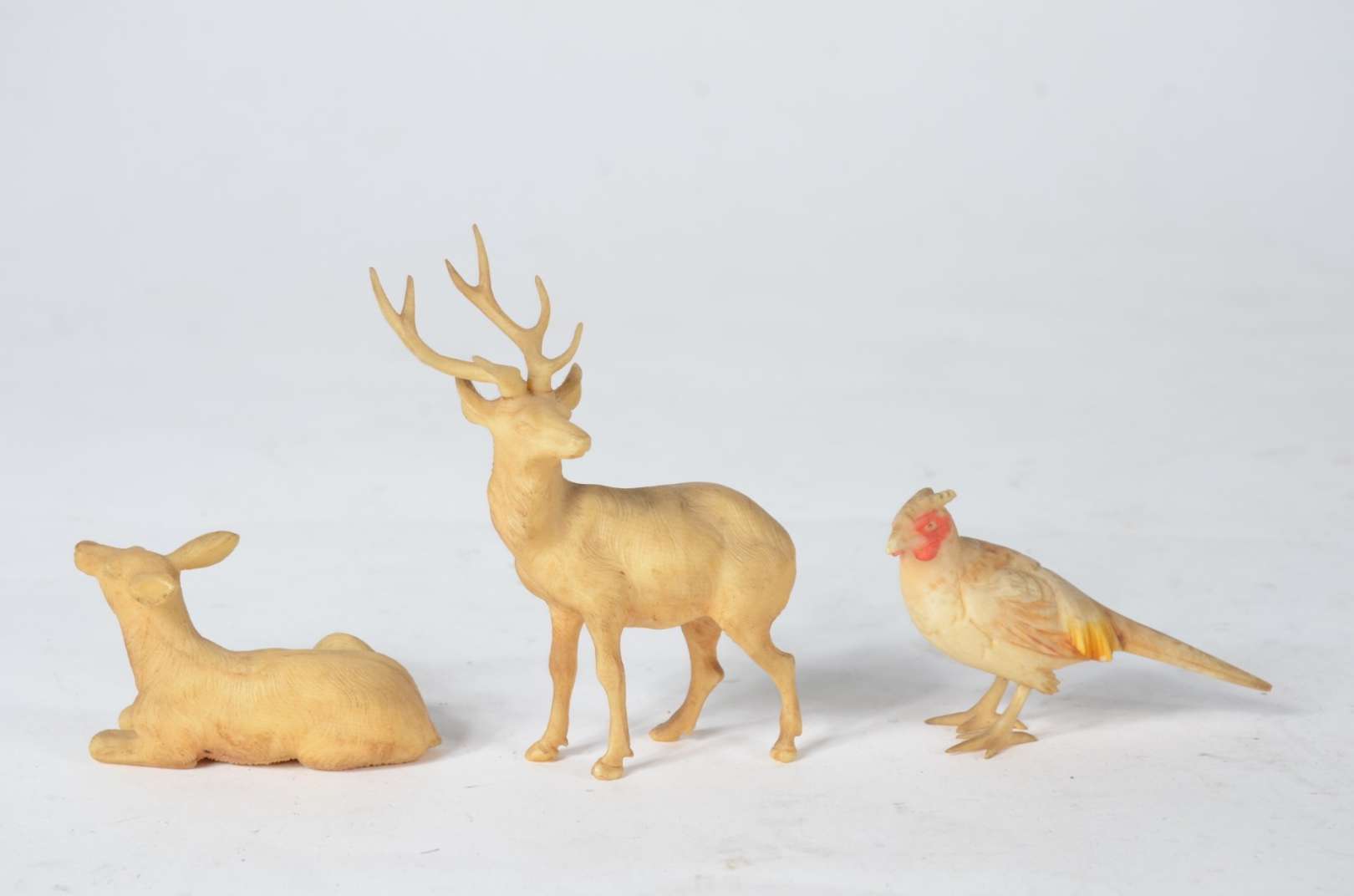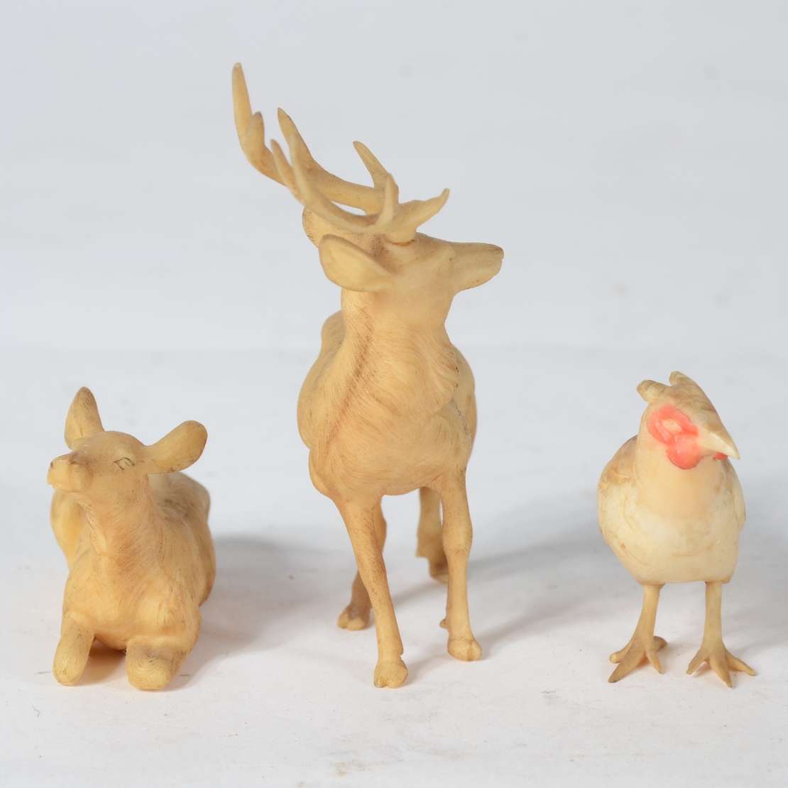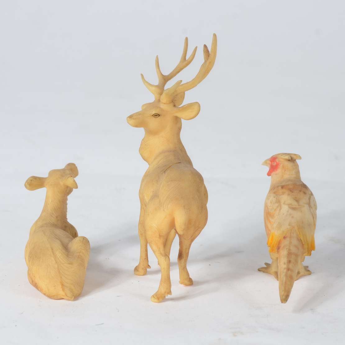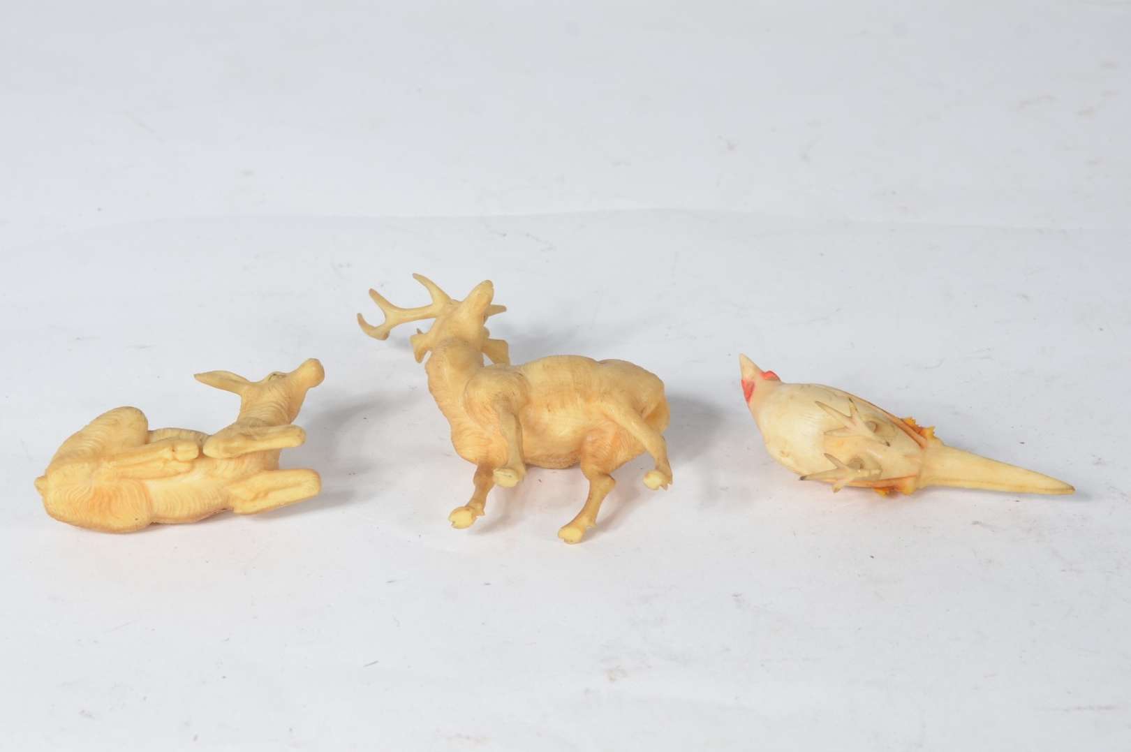 Três pequenas esculturas representando animais, material não identificado.