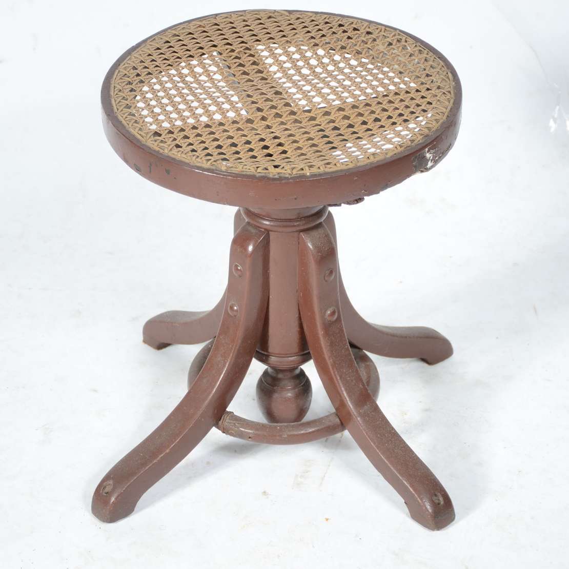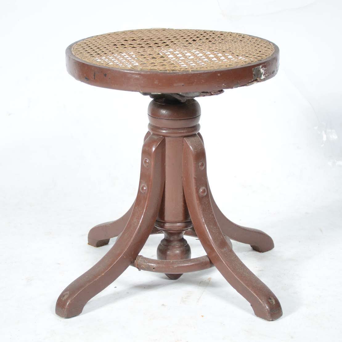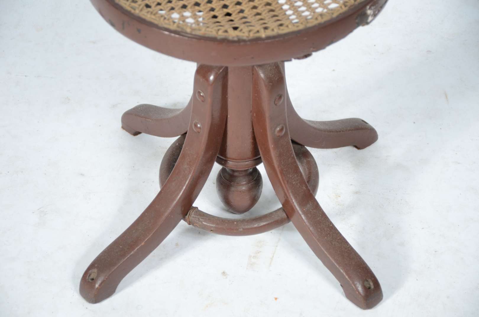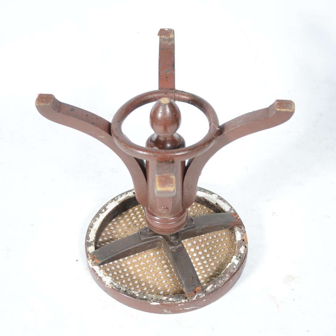 Mesa auxiliar de madeira nobre, platô inferior ligados por pernas cilíndricas frisadas.