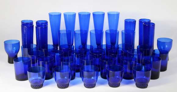 Serviço com 45 copos de vidro na cor azul, em diferentes tamanhos.