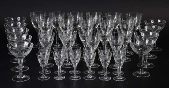 Serviço de cristal com ramos lapidados, composto de 11 taças para vinho tinto, 9 para vinho branco, 12 para licor e 9...