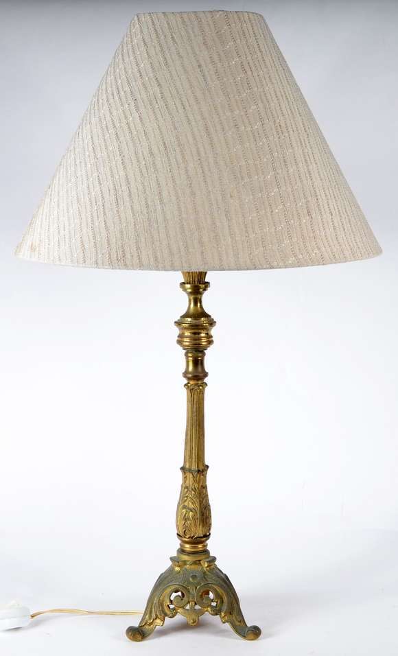 Abatjour de metal dourado com cúpula de tecido na cor bege (desgastes).